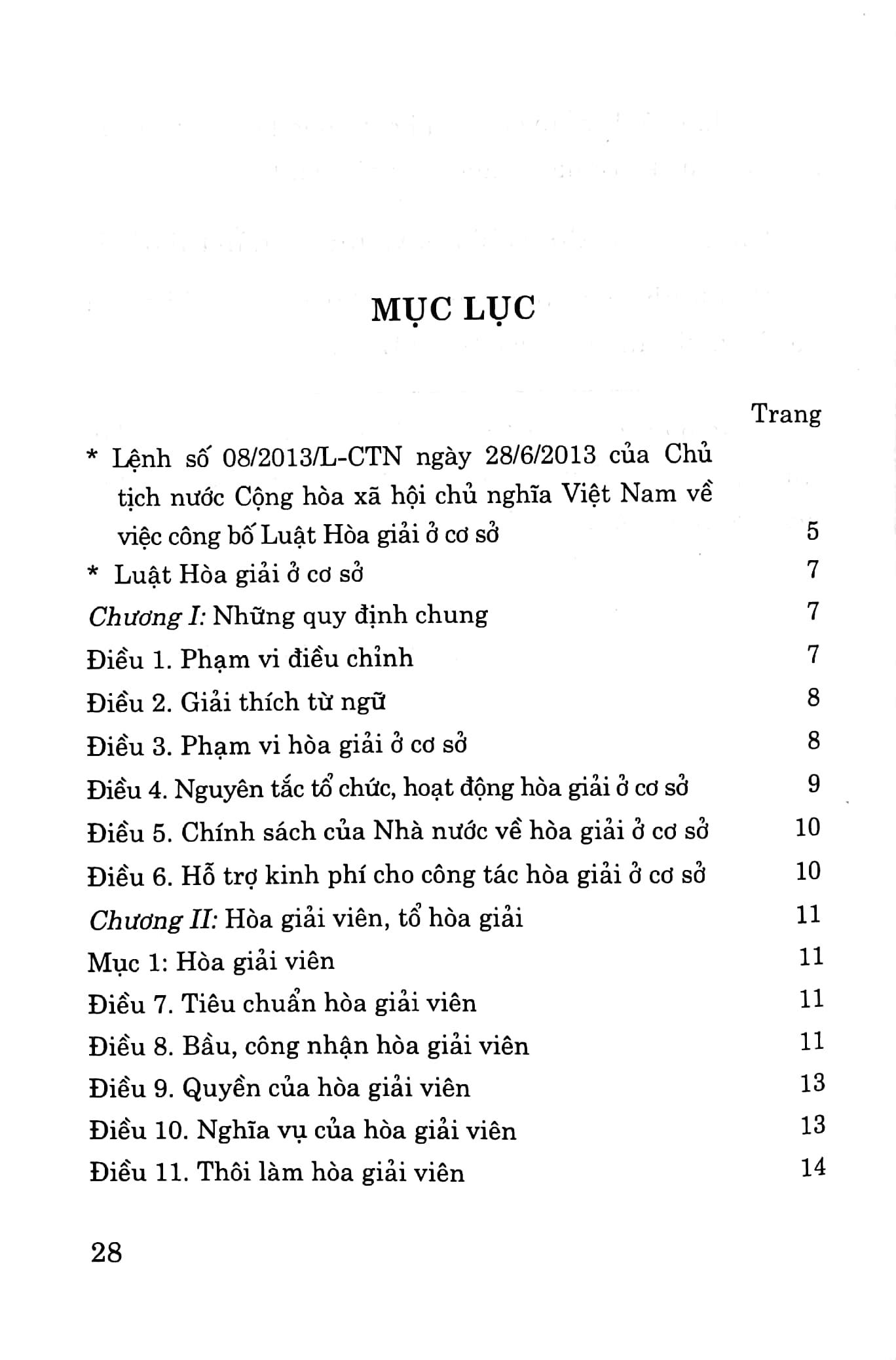 Luật Hòa Giải Ở Cơ Sở (Hiện Hành) Luật Hòa giải ở cơ sở (hiện hành) được Quốc hội nước Cộng hòa xã hội chủ nghĩa Việt Nam khóa XIII, kỳ họp thứ 5 thông qua ngày 20/6/2013, có hiệu lực thi hành từ ngày 01/01/2014. Luật gồm 5 chương, 33 điều, quy định nguyên tắc, chính sách của Nhà nước về hòa giải ở cơ sở, hòa giải viên, tổ hòa giải; hoạt động hòa giải ở cơ sở; trách nhiệm của cơ quan, tổ chức trong hoạt động hòa giải ở cơ sở.