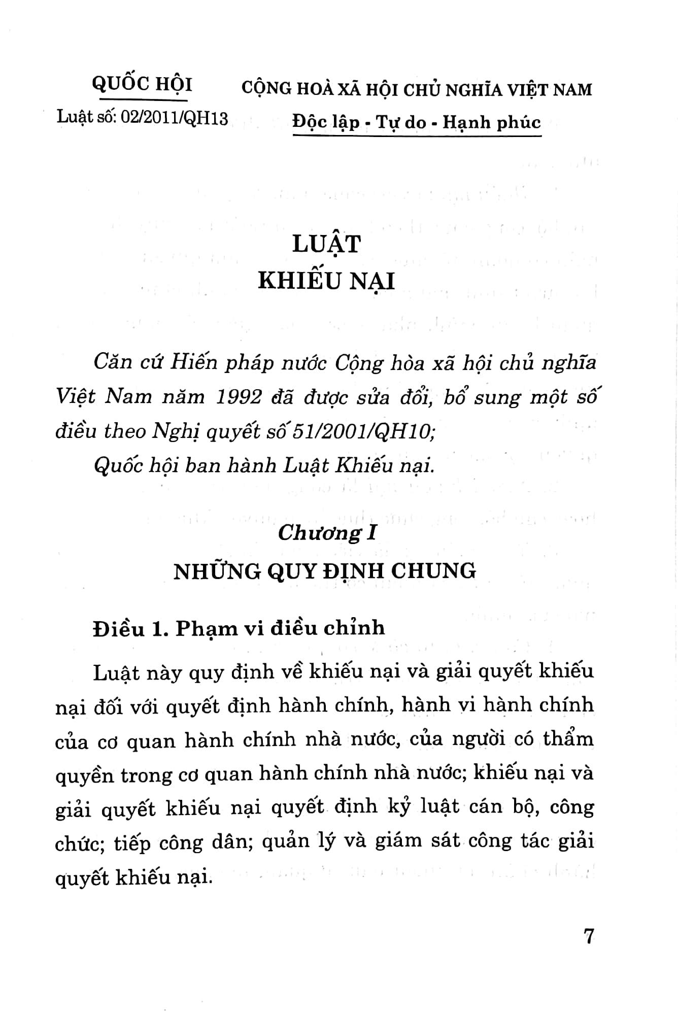 Luật Khiếu nại được Quốc hội khóa XIII, kỳ họp thứ 2 thông qua ngày 11/11/2011, có hiệu lực thi hành từ ngày 01/7/2012.