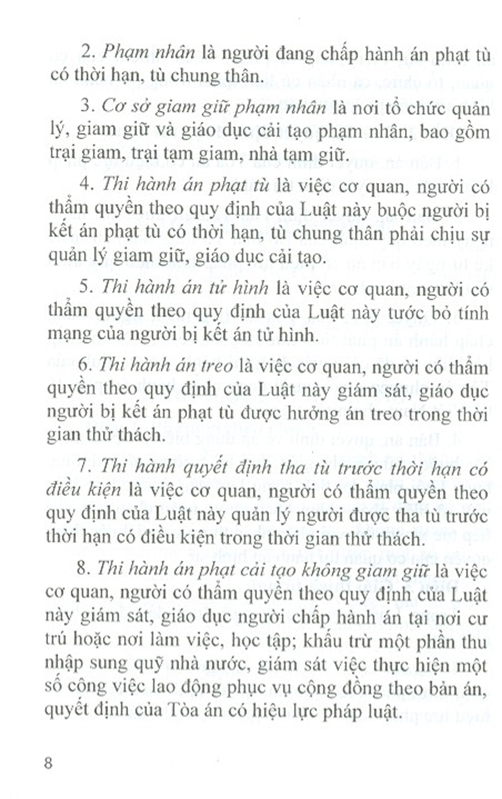 Mua tại TiktokTrình bày nội dung Luật Thi hành án hình sự với những quy định chung và quy định cụ thể về hệ thống tổ chức thi hành án hình sự, nhiệm vụ, quyền hạn của cơ quan có thẩm quyền trong thi hành án hình sự; thi hành án phạt tù, tử hình, án treo, án phạt cảnh cáo, cải tạo không giam giữ, cấm cư trú, quản chế và các điều khoản thi hành