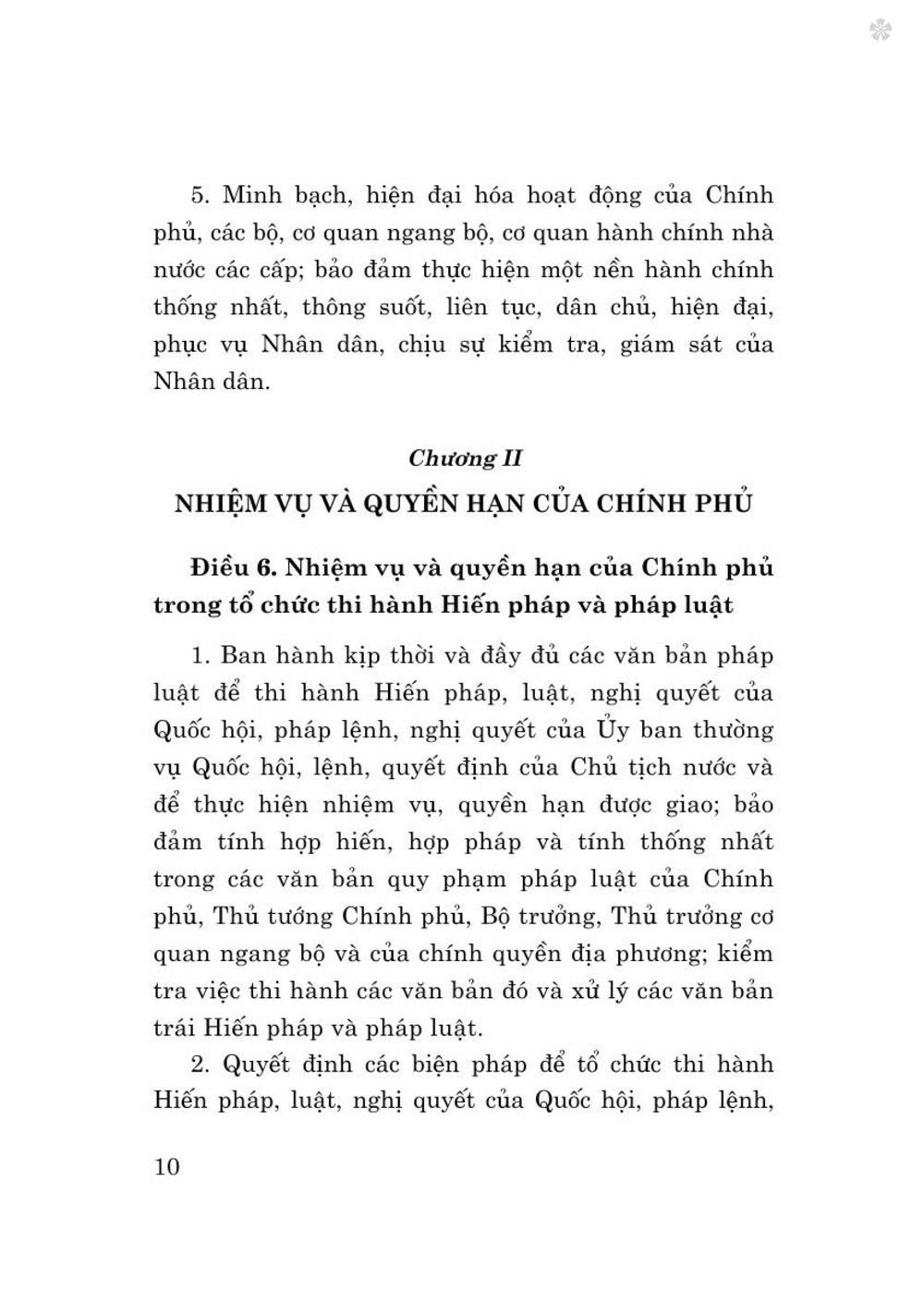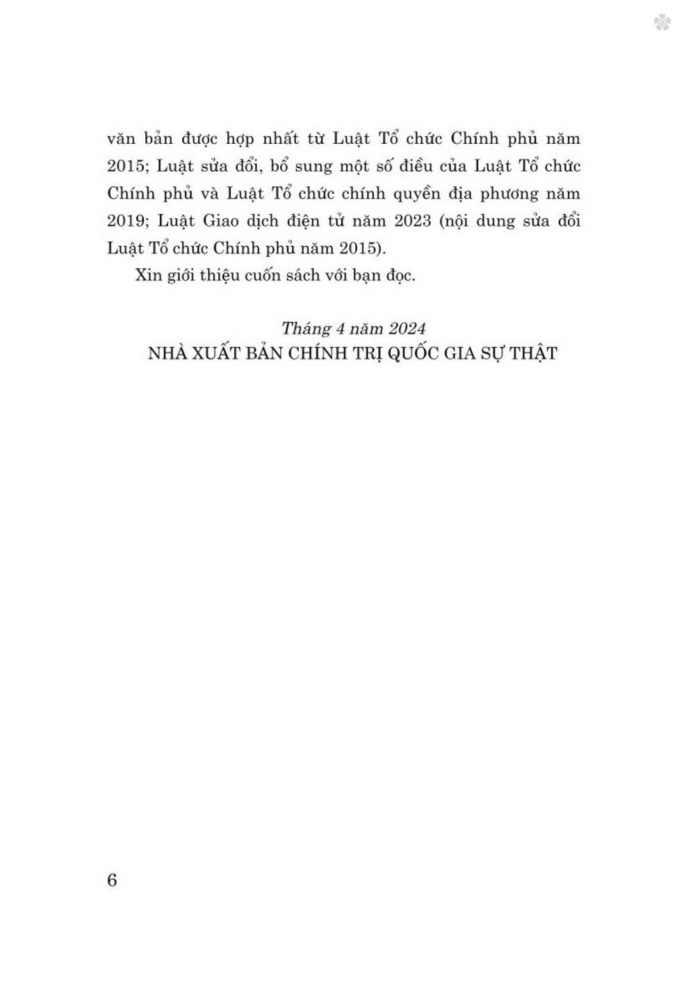 Cuốn sách Luật Tổ chức Chính phủ năm 2015 (sửa đổi, bổ sung năm 2019, 2023) là văn bản được hợp nhất từ Luật Tổ chức Chính phủ năm 2015; Luật sửa đổi, bổ sung một số điều của Luật Tổ chức Chính phủ và Luật Tổ chức chính quyền địa phương năm 2019; Luật Giao dịch điện tử năm 2023 (nội dung sửa đổi luật Tổ chức Chính phủ năm 2015), giúp bạn đọc thuận tiện trong việc tìm hiểu và áp dụng pháp luật về tổ chức Chính phủ.