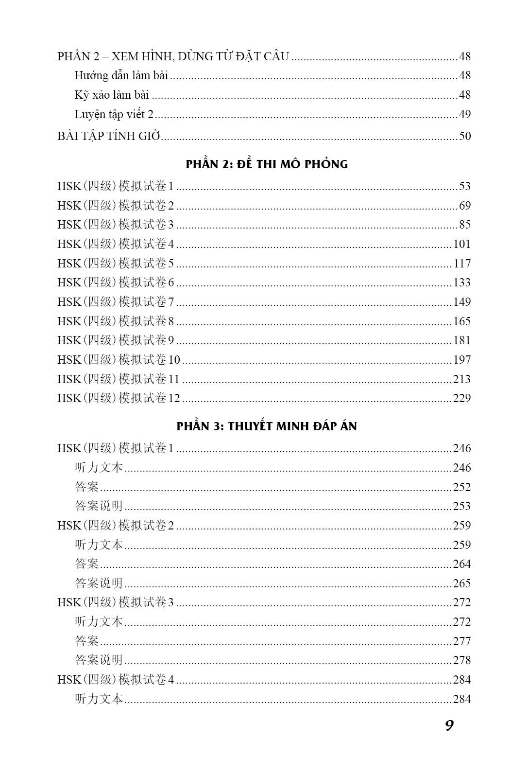 - Phần 3: Thuyết minh đáp án (cung cấp Văn bản ghi âm, Đáp án và Thuyết minh đáp án của 12 đề mô phỏng ở phần 2) Ngoài những đề thi mô phỏng ở phần 2, sách Luyện giải đề HSK cấp 4 còn có hệ thống bài tập thuộc phần 1 (Phần Những kỹ xảo giải đề). Hệ thống bài tập này bao gồm 2 nhóm: nhóm Bài tập kỹ xảo và nhóm Bài tập tính giờ.