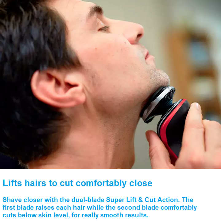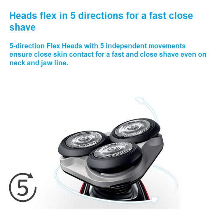 • 3 đầu cạo thiết kế lượn tròn linh động, giúp người dùng cạo sát rất êm ái mà không cắt xước vào da.