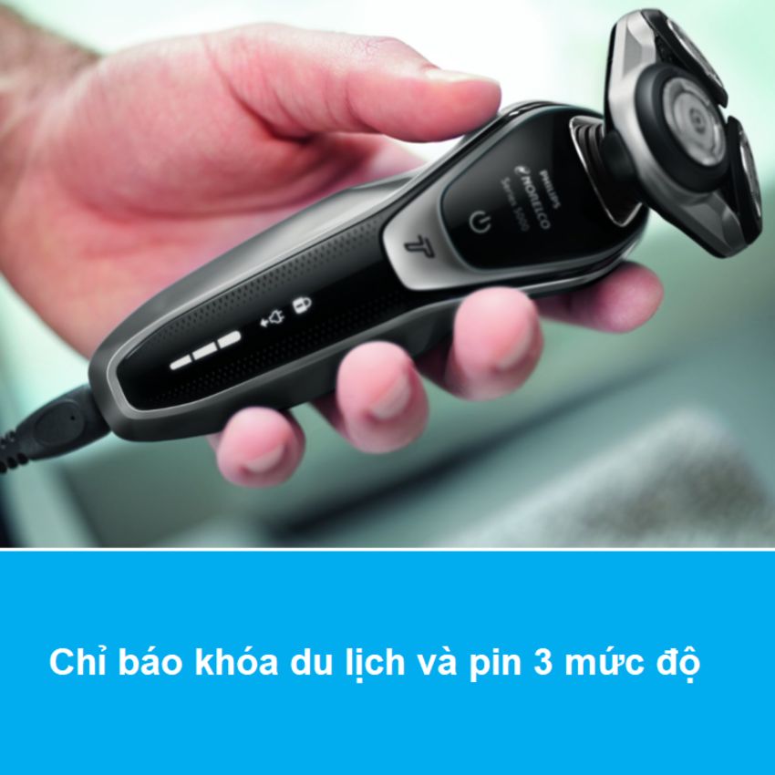 • Khi sạc pin trong 1 giờ, bạn sẽ có tối đa 45 phút để cạo râu, tương đương với 15 lần cạo. Bên cạnh đó bạn cũng có thể sạc nhanh trong 5 phút cho một lần cạo khi cần gấp. Đèn tích hợp 3 mức pin chỉ báo và đèn báo khóa