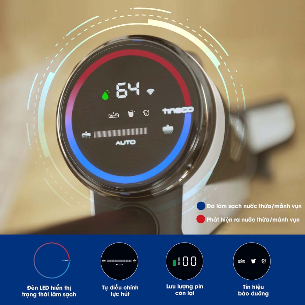 Máy hút bụi lau sàn khô ướt tự giặt giẻ Tineco Floor One S3 được trang bị màn hình LED sắc nét, hiển thị đầy đủ các trạng thái làm việc và vệ sinh như: như % pin, công suất hút, mức độ bẩn, các chế độ thông báo như hết nước, nước đầy một cách chi tiết và dễ hiểu.