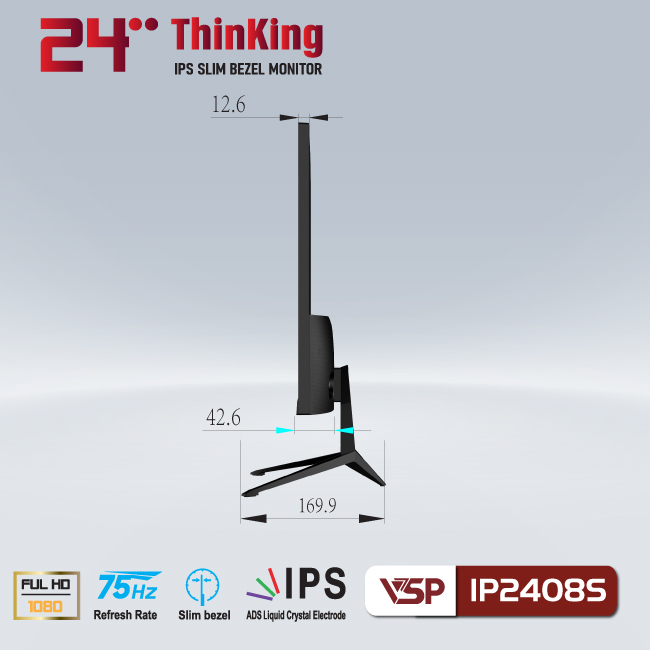 - FPS/RTS Gaming mode switch MÔ TẢ SẢN PHẨM Màn hình VSP IPS Thinking đáp ứng yêu cầu làm việc và giải trí cho văn phòng của bạn Màn hình VSP ThinKing với thiết kế tinh giản, được trang bị tấm nền IPS phù hợp cho nhu cầu đa nhiệm, làm việc văn phòng và đáp ứng các yêu cầu công việc cho các kỹ sư ứng dụng với nhiều ứng dụng thiết kế đồ hoạ. Góc nhìn tiêu chuẩn kèm Full HD khung hình 16:9 với độ phân giải 1920X1080 Pixels @75Hz cho phép hiển thị hình ảnh rỏ nét và màu sắc sống động chân thật. IPS Liquid crytal Electrode Full HD 1920x1080 Tốc Độ Làm Mới 75hz Sẵn sàng cho Gaming VSP IPS MONITOR MÀU SẮC CHO HÌNH ẢNH SỐNG ĐỘNG Màn hình tràn viền VSP ThinKing sống động mọi chi tiết, sắc nét đến từng điểm ảnh nhờ tấm nền IPS. Hiển thị màu sắc đẹp hơn, hiển thị trung thực hơn. Độ phân giải cao hơn hiển thị từng tông màu tươi sinh động, màn hình tràn viền VSP ThinKing cho hiển thị khung hình rộng lớn không chỉ mang đến trải nghiệm xem vượt trội, mà còn thúc đẩy hiệu suất làm việc tối ưu. Panel nền tiêu chẩn 23.8" 16.7 Triệu điểm màu Viền mỏng Chống nhấp nháy gây mỏi mắt Góc nhìn rộng sáng hơn Hỗ trợ treo tường dễ dàng Rực Rỡ Sắc Màu sinh động - Hình ảnh tươi sắc với công nghệ màn hình Cao Cấp của Tech Vision Tỷ lệ tương phản tối ưu 1000:1: công nghệ tấm nền BOE/IPS của Tech Vision cùng với công nghệ IPS cho sắc đen sâu thẳm hơn, sắc trắng tinh khiết và màu sắc sống động hơn bao giờ hết, Sống động mọi chi tiết, sắc nét đến từng điểm ảnh nhờ tấm nền IPS chất lượng cao. Tối ưu hình ảnh và hiệu suất công việc cho các kỹ sư và đồ họa viên đồng thời hiệu suất hình ảnh mượt mà cho người dùng chơi game. Thiết kế đơn giản, tinh tế cho góc làm việc của bạn Màn hình VSP Thiking V series được thiết kế đơn giản, tinh tế từng góc cạnh cho không gian làm việc, học tập của bạn gọn gàng hơn bao giờ hết. Với màn hình VSP V series chân đế bằng hợp kim gọn gàng không chiếm nhiều không gian tạo cảm giác thoải mái hơn bao giờ hết khi làm việc giải trí cùng màn hình VSP, mặt sau trang bị tắm gương phản chiếu với Logo VSP hiệu ứng Led-light mang lại ấn tượng mạnh mẽ cho màn hình VSP IPS2408S. Khoản khắc ấn tượng trong những phân cảnh thú vị với tầng số quét 75Hz Tần số quét 75Hz vượt trội giúp mọi chuyển động trở nên mượt mà hơn, cho bạn dễ dàng bắt kịp các khoảnh khắc ấn tượng trong những phân cảnh thú vị. Giờ đây, bạn có thể thưởng thức mọi nội dung đỉnh cao và trải nghiệm những trận game gay cấn mà không có hiện tượng giựt hình hay bóng mờ khó chịu. Hỗ trợ các tính năng gaming: