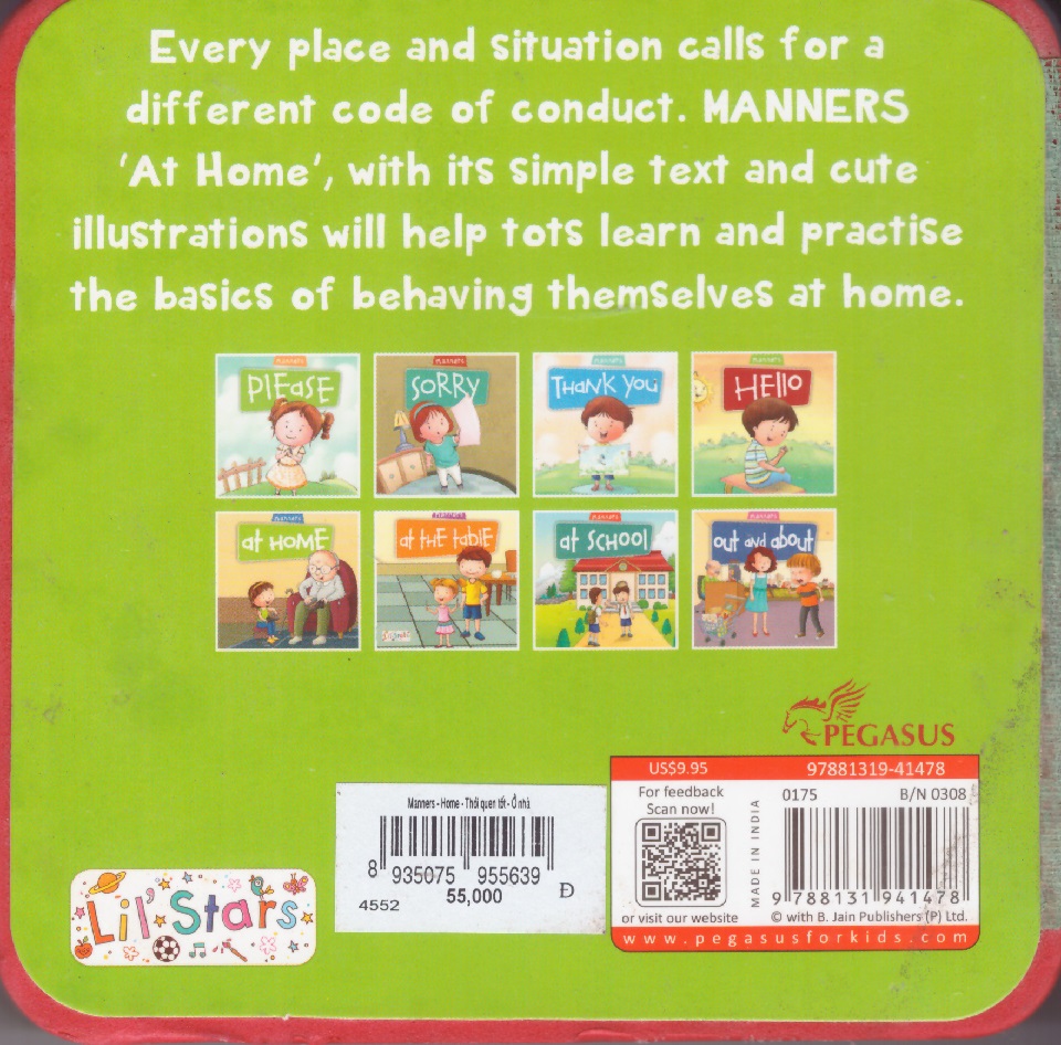 Every place and situation calls for a different code of conduct. Manners "At home", with its simple text and cute illustrations, will help tots learn and practise the basics of behaving themselves at home