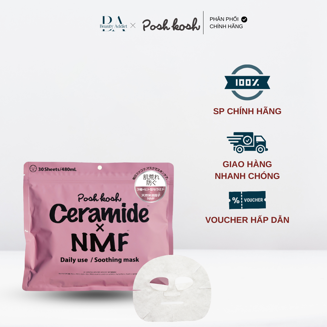 Chỉ với 3 phút đơn giản mỗi ngày thêm vào chu trình dưỡng da, bạn sẽ thấy làn da của bạn sẽ thay đổi rõ rệt!Mặt nạ Posh Kosh 30 miếng sẽ giúp làn da của bạn được cải thiện tốt lên từng ngày, một túi mặt nạ chứ 480ml tinh chất dưỡng tương đương mỗi miếng mặt nạ là 16ml tinh chất đậm đặc bổ sung cho làn da của bạn! POSH KOSH SO MASK với 2 thành phần chính là 4 loại Ceramides và NMF giúp làm mịn da, ngăn ngừa tình trạng khô ráp và tăng cường hàng rào bảo vệ da. Các thành phần nổi bật khác như: ·      Ceramide NG, Ceramide NP, Ceramide AP: Là một trong 9 loại Ceramides có thể được tìm thấy tự nhiên ở lớp trên của da và đóng một vai trò cực kỳ quan trọng trong việc hình thành hàng rào bảo vệ da khỏe mạnh và giữ cho da ngậm nước. ·      Ceramide từ thực vật ( chiết xuất từ quýt Nhật): bổ sung độ ẩm và ngăn ngừa mất ẩm, làm cho da mềm mại, mịn màng và khỏe mạnh ·      Sodium hyaluronate crosspolymer-2 : Hoạt chất góp phần dưỡng da ẩm chuyên sâu, phục hồi da khô sạm, hỗ trợ cân bằng ẩm và ngăn ngừa lão hóa. ·      NMF : giúp cải thiện vẻ bề ngoài của làn da, cho da trông trẻ trung, đầy đặn và tràn đầy sức sống. ·      Sản phẩm có hương lavender thư giãn.   Mặt nạt Posh Kosh kết hợp giữa 2 hợp chất giúp hỗ trợ và tăng gấp đôi hiệu quả trên da, giúp bạn tiết kiệm thời gian hơn. HDSD:  ·      Sau khi làm sạch da mặt, lau sơ da với lotion hoặc dưỡng ẩm bằng xịt khoáng và sau đó đắp mặt nạ lên da, điều chỉnh vị trí cho phù hợp với khuôn mặt của bạn. ·      Để mặt nạ trên da từ 3-5 phút, sau đó tháo ra và gấp gọn, thoa mặt nạ đã gói gọn theo vòng tròn hướng từ trong ra ngoài trên mặt và vùng cổ. ·      Vỗ nhẹ cho tinh chất thấm đều trên da, tiếp tục thực hiện các bước dưỡng da sau đó. ·      Không cần rửa lại với nước sau khi đắp mặt nạ.
