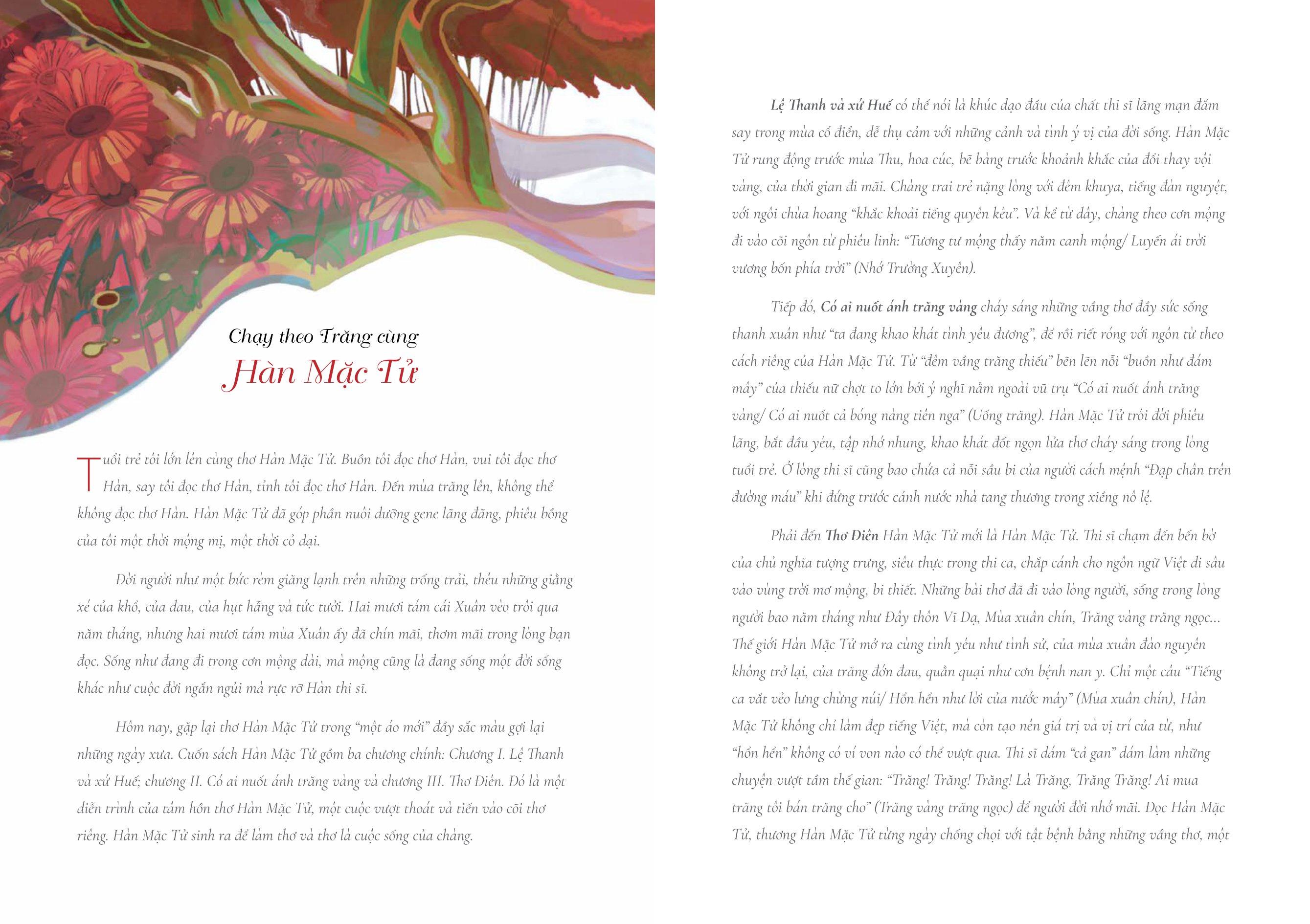 “Dạo chơi trong thơ Hàn, ta cùng đi từ những tiếng ngâm, tiếng đàn trong Lệ Thanh Thi Tập, đến cùng tiếng dịu dàng, nhung nhớ trong Gái Quê, rồi lại gào thét, điên cuồng và mất đi cùng Đau Thương. Qua một hành trình thơ, ta thấy được hành trình của một đời người. Dù đã xa thế hệ bây giờ hơn một nửa thế kỉ, những áng thơ Hàn Mặc Tử vẫn tìm được cách riêng để sống tiếp trong tâm hồn những người trẻ yêu thơ… Người biên soạn đồng thời là họa sĩ minh họa mong bạn sẽ có những trải nghiệm tuyệt vời từ hình thức cho đến nội dung khi đọc cuốn sách này.” (Nhâm Hồng Ngọc)