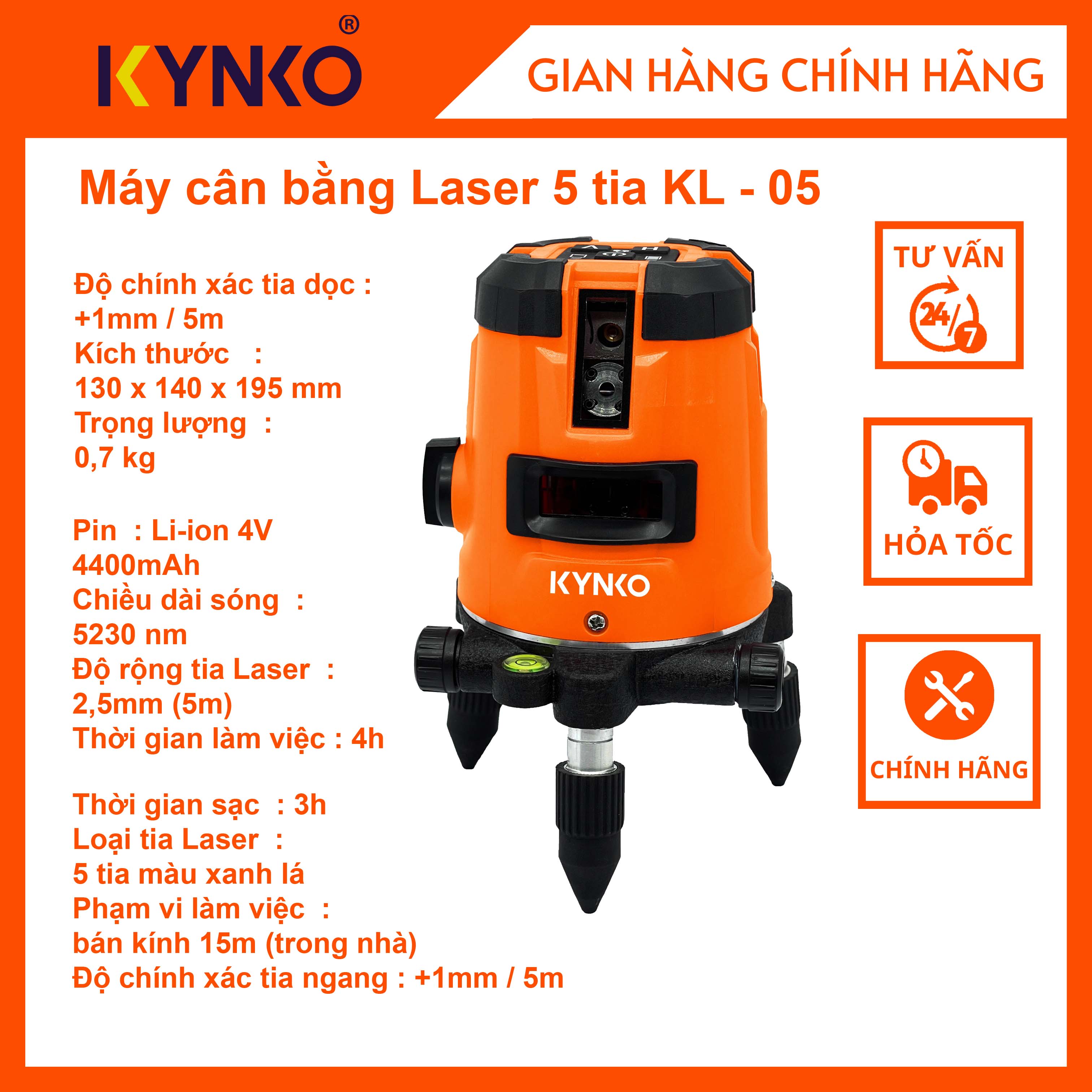 Máy cân bằng Laser 5 tia - KL05 Máy sử dụng bóng laser Sharp nhập khẩu chính hãng. Công nghệ tia xanh lá tinh khiết, hiển thị rõ, mạnh, độ mỏng tia chỉ 1mm.