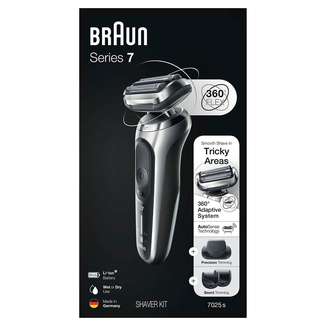 Braun Series 7 7025S có đầu cạo thích ứng có thể xoay trên hai mặt phẳng: lên xuống và từ trái sang phải . đảm bảo sự tiếp xúc tối ưu với da bất kể khu vực nào.