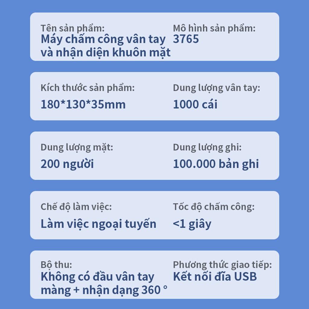 TÍNH NĂNG SẢN PHẨM:Lưu trữ dấu vân tay lên tới 1000 vân tayLưu trữ khuôn mặt lên tới 200Dung lượng ghi: 200KChế độ làm việc: Ngoại tuyếnCó thể thay đổi 24 ca làm việc khác nhau, phù hợp, doanh nghiệp ...