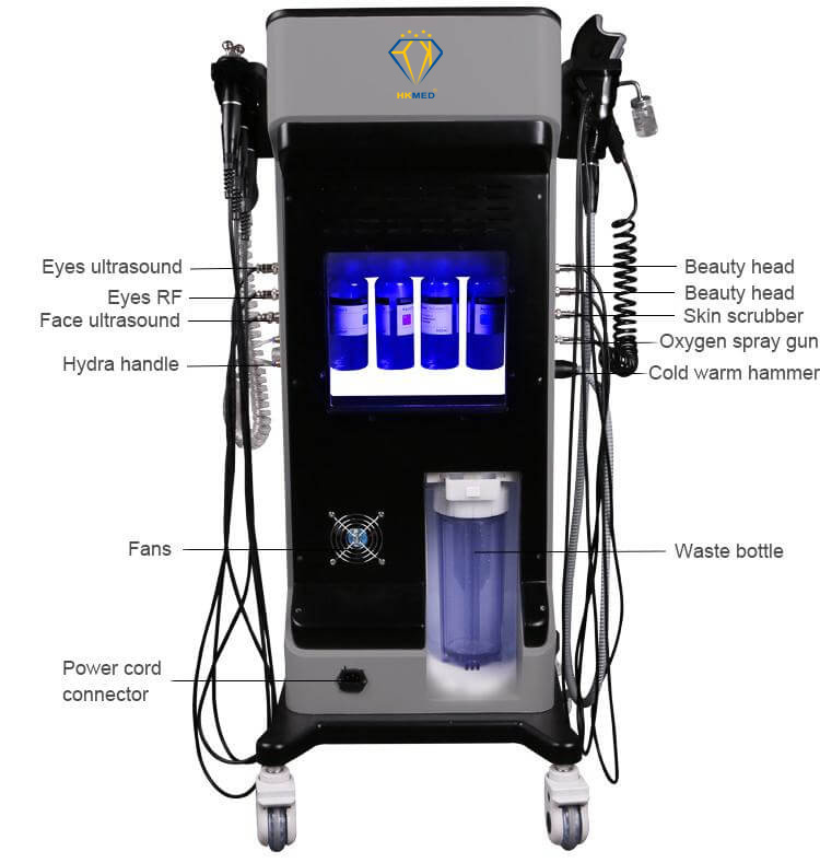 - Được trang bị 8 tay cầm: cold warm hammer, hydra peeling handle, ultrasonic skin scrubber, eyes ultrasound, face ultrasound, eyes rf, oxygen spray mist gun, beuaty head