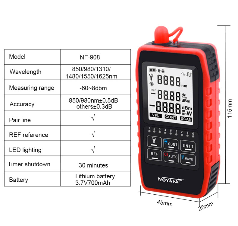 ✨Máy Đo Công Suất Quang Và Test Cáp Mạng NOYAFA NF-908 (Dùng Pin Sạc) - Hàng Chính Hãng. NOYAFA NF-908 Multifunction Optical Power Meter Visual Fault Locator Network Cable Test Optical Fiber Tester