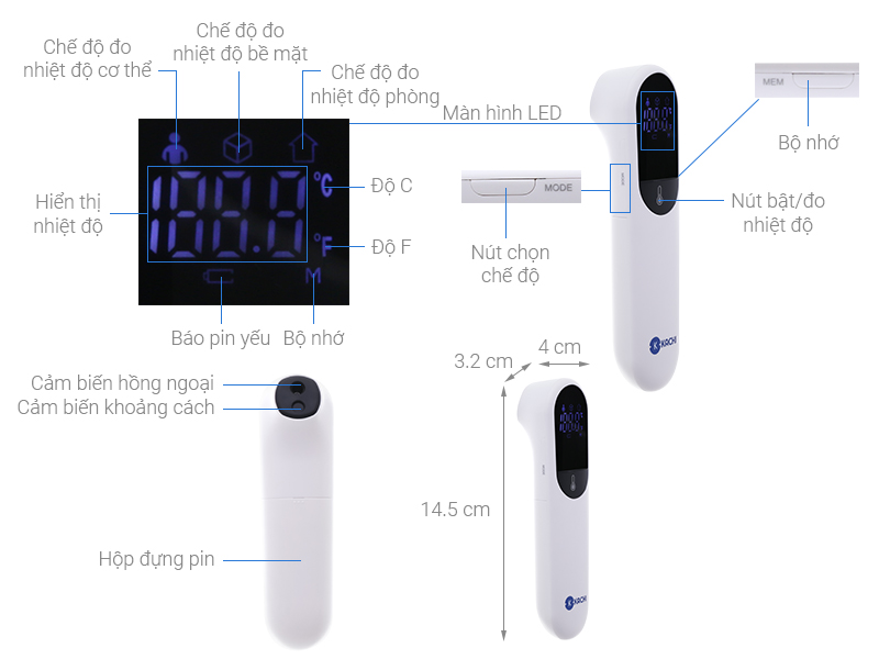 Đo nhiệt độ cơ thể người và vật thể Độ chính xác lên đến 0.2 độ C Cho kết quả đo sau 1 giây Tự động tắt sau 60 giây không thao tác Khoảng cách