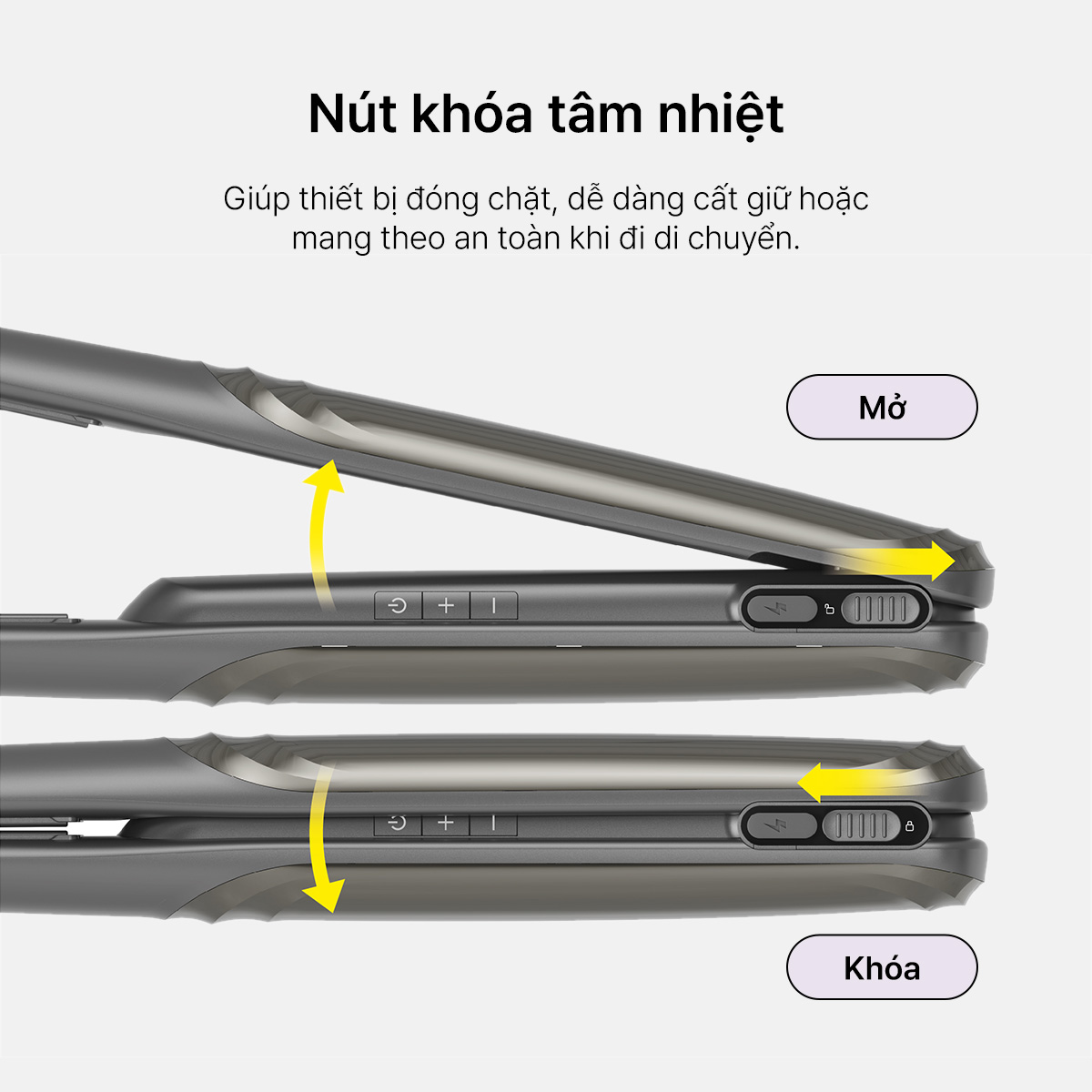 NÚT KHÓA TẤM NHIỆT: Giúp thiết bị đóng chặt, dễ dàng cất giữ hoặc mang theo an toàn khi đi di chuyển.