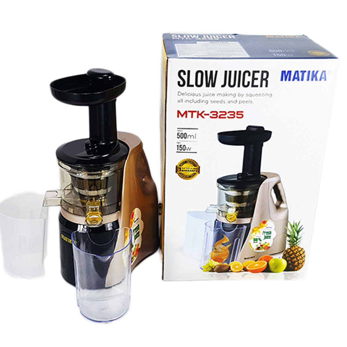 Thông số kĩ thuật máy ép chậm Matika MTK-3235 Loại máy: Máy ép chậm (máy ép trái cây hoa quả chậm) Model: MTK-3235 Công suất: 150W. Dung tích cối: 1000ml. Chất liệu bộ lọc: Thép inox 304. Chất liệu thân