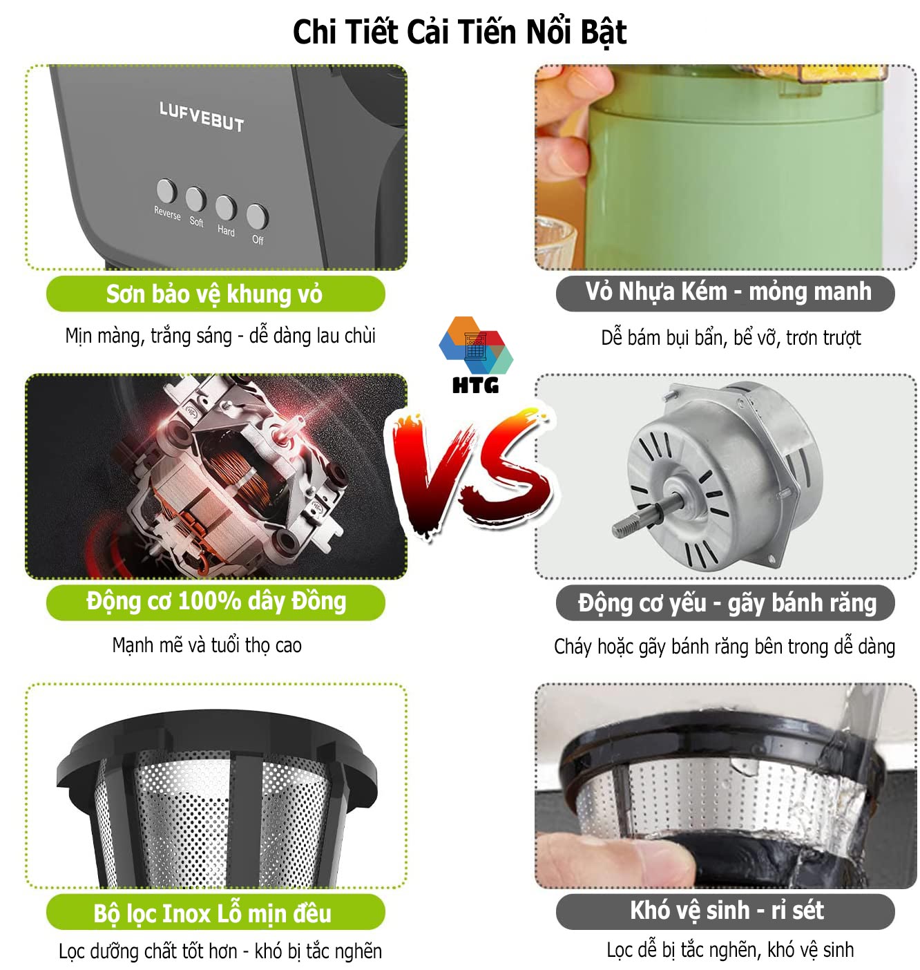 Ưu điểm nổi trội của máy ép chậm so với máy ép trái cây thông thường - Đường kính lớn 7.8cm, không cần cắt nhỏ, ép trực tiếp - Tỷ lệ nước ép nguyên chất