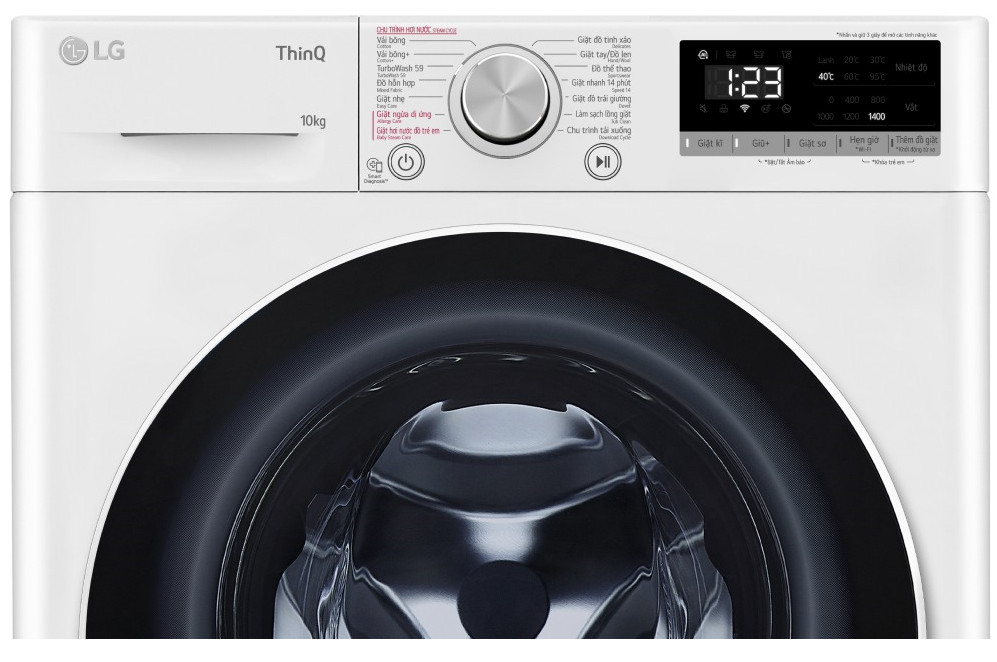 - Trang bị thêm công nghệ Inverter điều khiển động cơ bằng vi xử lý nên trong quá trình sử dụng đảm bảo tiết kiệm điện năng, máy vận hành êm ái. Hình ảnh chỉ mang tính chất minh họa Tiện ích - Chẩn đoán lỗi Smart Diagnosis: giúp người dùng kịp thời phát hiện lỗi có trên máy giặt nhằm đưa ra giải pháp kịp thời. - Khóa trẻ em: khóa phím chức năng trên máy giặt Inverter này giúp quá trình vận hành không bị gián đoạn hoặc trẻ em nghịch phá. - Thêm đồ trong khi giặt: khi máy đang vận hành bạn vẫn có thể dễ dàng cho thêm đồ bị bỏ sót vào mà không mất công bấm tạm ngưng hoặc phải chạy lại chu trình giặt từ đầu. - Vệ sinh lồng giặt: làm hạn chế các vi khuẩn, bụi vải, cặn bẩn có trên máy giặt để hạn chế tình trạng vi khuẩn sinh sôi và tăng tuổi thọ cho máy. - Điều khiển máy giặt từ xa qua ứng dụng LG ThinQ có trên chiếc điện thoại smartphone hiện đại và tiện lợi. Hình ảnh chỉ mang tính chất minh họa Tóm lại đây là một sản phẩm có thiết kế đẹp mắt và được tích hợp đa dạng chương trình giặt cũng như công nghệ nhằm tối ưu quá trình giặt giũ và đảm bảo máy tiết kiệm nước, điện và luôn vận hành êm ái. Nếu nhà bạn có từ 5 – 7 người thì chiếc máy giặt 10 kg này là lựa chọn đáng cân nhắc.