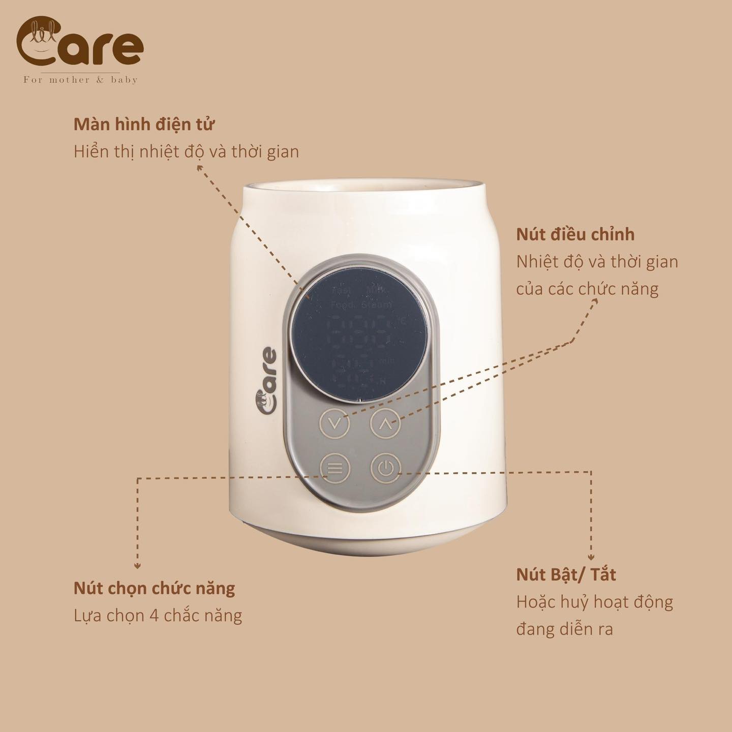 - 5 chức năng: hâm sữa nhanh, giữ ấm 24 giờ, hâm thức ăn, rã đông, tiệt trùng. - Hâm sữa ở nhiệt độ lý tưởng 37 – 40°C, đảm bảo giữ trọn dinh dưỡng