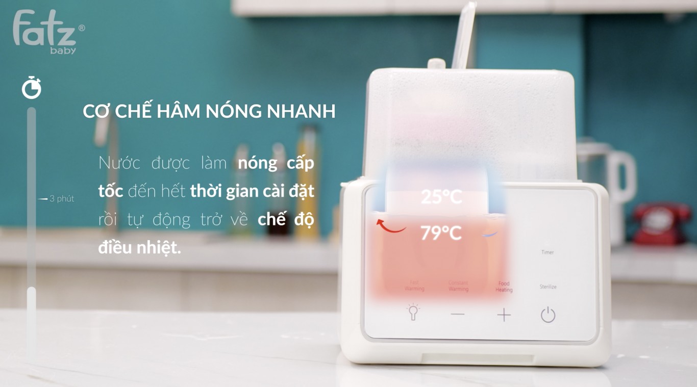 Quick 12 là một trong những sản phẩm giá rẻ thuộc dòng máy đun và hâm nước pha sữa điện tử của Fatzbaby. Sở hữu những chức năng cơ bản như đun nước, khử clo và giữ ấm nước, Quick 12 đáp ứng những nhu cầu cơ bản của mẹ đối với một chiếc máy đun và hâm nước pha sữa cho bé. Thiết kế mới nổi bật là bình thủy tinh dung tích lớn, cùng với tính năng hẹn giờ rất tiện lợi cho mẹ trong quá trình sử dụng. 1. THIẾT KẾ & CÔNG DỤNG Tích hợp 3 chế độ hoạt động: - Đun sôi nước chỉ trong 5 phút: QUICK 12 với công suất 600W đun nước siêu tốc trong vài phút, vô cùng tiện lợi nếu mẹ cần nước sôi gấp. - Giữ ấm nước từ 12 đến 48 giờ: Sau khi đun sôi, máy sẽ tự động trở về chế độ giữ ấm. Khoảng nhiệt độ điều chỉnh từ 37°C đến 95°C. Nhiệt độ giữ ấm nước còn có thể điều chỉnh linh hoạt ở 4 cấp độ tương ứng với 4 biểu tượng trên thân máy: + 45°C: pha sữa + 70°C: pha bột ăn dặm, ngũ cốc + 80°C: pha trà + 90°C: pha cà phê - Khử Clo tồn dư chỉ sau 5 phút: Trong nước máy sinh hoạt có một hàm lượng Clo nhất định dùng để tiệt trùng. Hàm lượng Clo trong nước quá cao, trẻ có nguy cơ bị ngộ độc Clo cấp tính vì hệ miễn dịch trẻ còn rất yếu. Máy FB3503HB - QUICK 12 sẽ giúp mẹ an tâm hơn vì chỉ sau 5 phút, máy sẽ khử hết Clo tồn dư trong nước máy. Thiết kế hiện đại, tiện lợi: Thân bình bằng thủy tinh cao cấp có thể chịu được nhiệt độ cao, trong suốt giúp mẹ có thể quan sát được mực nước bên trong dễ dàng. Ngoài ra, bình có thể chứa đến 1200ml nước, đây là lượng nước phù hợp mà cả gia đình có thể sử dụng vừa pha sữa, pha trà, ngũ cốc,... Chức năng bộ nhớ: máy sẽ động ghi nhớ thói quen của mẹ khi sử dụng, nếu mẹ thường xuyên pha sữa thì máy sẽ ghi nhớ nhiệt độ pha sữa mà mẹ thường sử dụng, thì nước sẽ tự động được làm ấm đến nhiệt độ đó mà mẹ không cần thực hiện thêm một thao tác nào sau khi nước sôi. Chức năng HẸN GIỜ : đây là một chức năng mới của các sản phẩm dòng QUICK, mẹ có thể hẹn đặt giờ đun và hâm nước ở một thời gian nhất định trong ngày mà không cần phải giữ ấm trong những khoản thời gian không cần thiết giúp mẹ tiết kiệm chi phí điện năng không cần thiết. Ngoài ra, thiết bị sẽ tự động ngắt sau khi hết thời gian . 2. LƯU Ý KHI SỬ DỤNG - Để đảm bảo độ bền của máy, không nên đổ nước quá 1200ml - Để máy xa tầm với của trẻ để đảm bảo an toàn - Không sử dụng sản phẩm với mục đích khác ngoài đun và giữ ấm nước - Vệ sinh bình sau mỗi lần sử dụng - Không sử dụng dung dịch tẩy trắng hoặc hóa chất / chất tẩy cho thiết bị. 3. CÁC THÔNG SỐ KỸ THUẬT - Nguồn điện: AC 220-240V, 50/60Hz; - Công suất: 600 W; - Dung tích: 1.2L; - Khối lượng: 1.15kg; - Kích thước : : 24.1 x 22.2 x 18.1 cm.