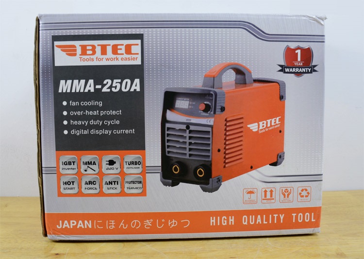 Máy hàn BTEC MMA 250A có cường độ dòng hàn tùy chỉnh tới 250A nên thích hợp sử dụng với que hàn 4mm - 3.2mm. Máy hàn BTEC MMA 250A áp dụng công nghệ biến tần IGBT cho phép đóng/ngắt nhanh an toàn, sử dụng tiết kiệm điện năng.