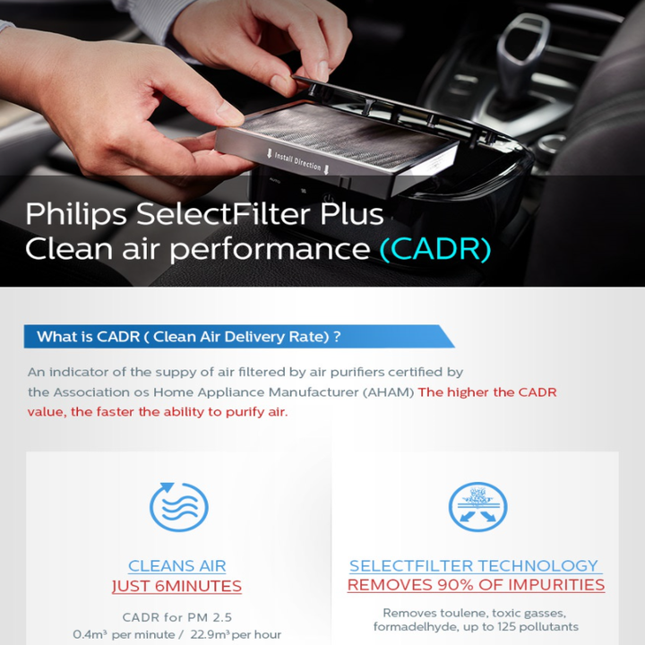 - Sử dụng công nghệ Airmax đời mới nhất của Philips, lọc 3 giai đoạn mạnh mẽ: Bộ lọc SelectFilter Plus tích hợp 3 giai đoạn độc đáo loại bỏ tới 125 chất gây ô nhiễm, vi khuẩn, bụi mịn và khí thải, thông qua các lớp HEPA và HESA. Được chứng nhận độc lập bởi Airmid Healthgroup, công nghệ SelectFilter Plus cũng loại bỏ tới 90% các chất gây dị ứng phấn hoa trong không khí. Thông số kỹ thuật sản phẩm - Lọc khí thải ô tô CADR NO2/SO2: 18 và 15m3 / giờ