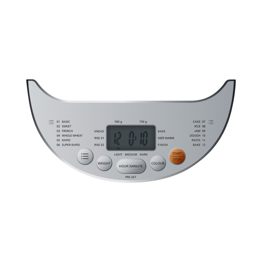 - 12 chương trình tự động Nhà sản xuất cung cấp 12 chương trình cài đặt trước: cơ bản, bánh mì ngọt, bánh mì Pháp, bánh mì ngũ cốc, nấu nhanh, nấu nhanh thêm, bánh, mứt, bột,