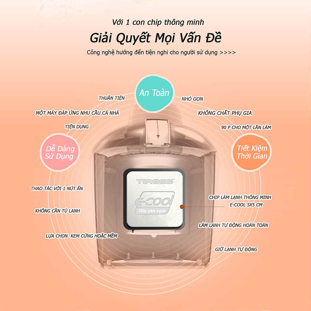 Ứng dụng công nghệ Ba Lan Máy làm kem tự động Tiross TS9090 có kiểu dáng nhỏ gọn, màu sắc đẹp mắt và sở hữu tính năng hiện đại, giúp bạn tự làm món kem thơm ngon, mát lạnh ngay tại nhà. Sản phẩm được thiết kế và ứng dụng công nghệ hiện đại của Ba Lan, mang lại sự tiện nghi cho mọi gia đình. Tiết kiệm thời gian Sản phẩm ứng dụng công nghệ hướng đến sự tiện nghi cho người dùng với 1 con chip thông minh có tên gọi Chip E-COOL. Chip E-COOL có khả năng làm lạnh siêu tốc, chỉ 90 phút cho một lần làm kem và thời gian giữ lạnh lâu gấp 2 lần máy làm kem thông thường giúp tiết kiệm điện năng cũng như thời gian chế biến. Hoạt động tự động và thông minh Máy làm kem tự động Tiross TS9090 chính hãng dễ dàng sử dụng chỉ với một thao tác. Bằng 1 nút ấn, máy sẽ tự động làm kem và tự động dừng khi hoàn tất quá trình làm kem rồi chuyển sang chế độ giữ lạnh trong 6 tiếng. Ngoài ra, để máy làm kem theo sở thích cá nhân, bạn có thể chọn chế độ kem cứng hoặc kem mềm. Với cách sử dụng đơn giản, bạn có thể trổ tài khéo léo, chế biến món kem mát lạnh ngày nóng cho cả nhà cùng thưởng thức. Chất liệu an toàn, thiết kế tiện dụng Máy được làm từ chất liệu nhựa tổng hợp và nhôm cao cấp có khả năng chịu lực, an toàn cho sức khỏe tuyệt đối. Ngoài ra, hệ thống làm lạnh tự động nhờ đó động cơ hạn chế sự rò rỉ, an toàn cho quá trình sử dụng. Sản phẩm có thiết kế tiện dụng, nắp bằng nhựa trong suốt có thể quan sát được quá trình làm kem, đồng thời nắp có lỗ cho phép bạn bỏ thêm nguyên liệu cả khi máy đang hoạt động. An toàn cho sức khỏe Sử dụng máy làm kem Tiross bạn không cần sử dụng đến tủ lạnh, nên không lo ngại kem ám mùi thức ăn, thực phẩm tươi sống. Kem tự chế biến tại nhà bằng trái cây không chứa chất phụ gia, chất bảo quản như các loại kem thông thường, tuyệt đối an toàn cho sức khỏe gia đình bạn. Hướng dẫn sử dụng