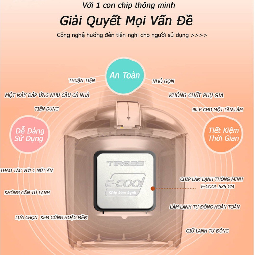 Máy làm kem TIROSS TS9091 được thiết kế theo công nghệ mới, ngoại hình sang trọng, gọn gàng và dễ dàng sử dụng. Kem là món ăn ưu thích của tất cả mọi người từ