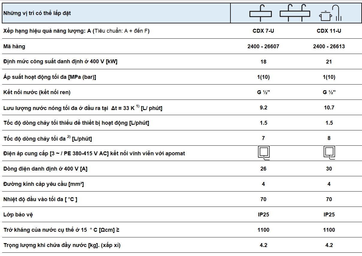 Đầu ống kết nối nước phía bên trên – Các mẫu CDX-U, CEX-U và CFX U có đầu ống kết nối nước ⅜” và có chiều hướng lên bên trên. Chúng được thiết kế với vị trí lắp đặt bên dưới chậu rửa và kết nối trực tiếp với đường ống cấp nước hoặc ống nước vào của vòi xả. Khoảng cách từ máy nước nóng tức thì đến vòi rửa càng ngắn sẽ càng đạt hiệu quả cao.