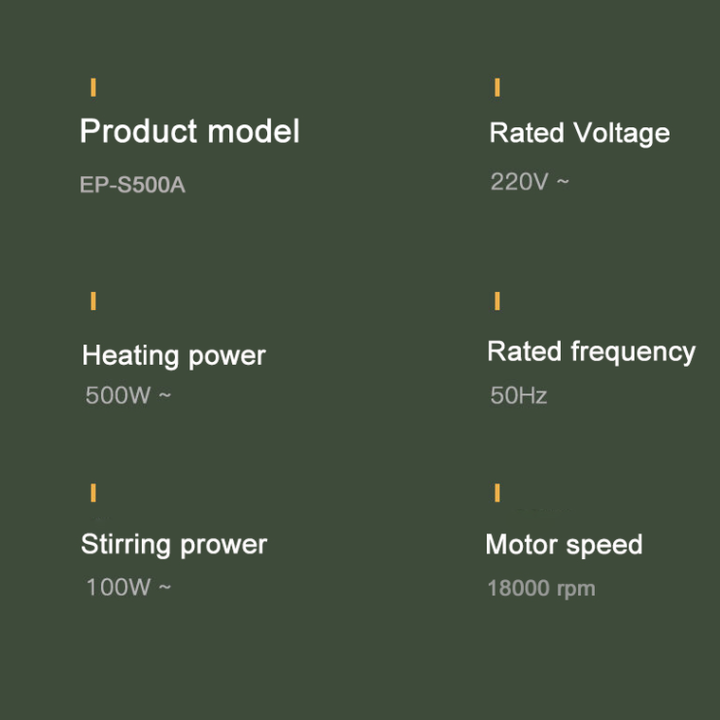 Điện áp : 220-240V/50Hz Năng lượng : A+ Công suất : 500W Lưỡi dao : 10 INOX 304 Dung tích: 800ml Điền khiển : cảm ứng tiếng việt Phụ kiện : Cốc đo, cốc hâm,