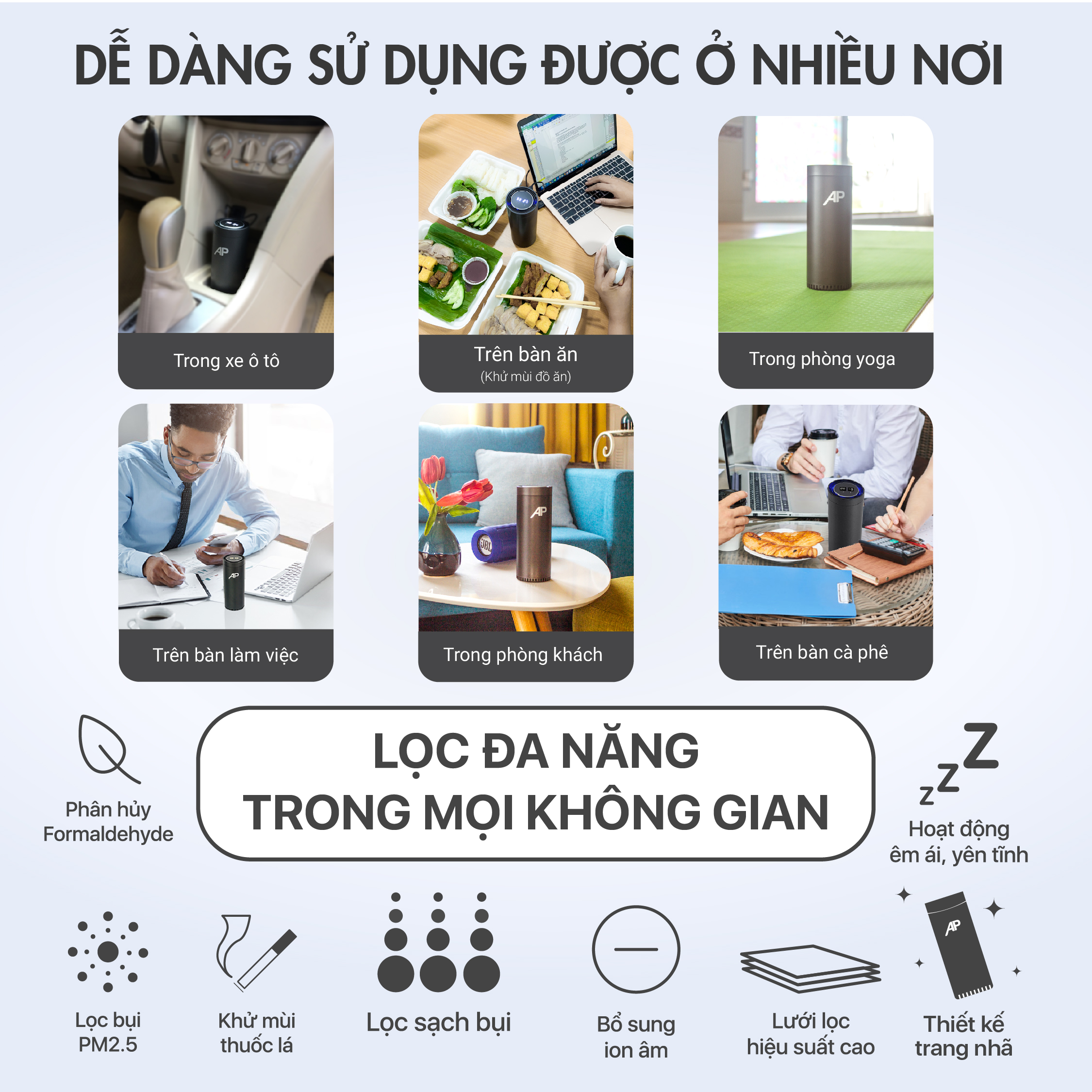 • Bộ chip vi xử lý điều khiển mọi chức năng của máy bao gồm quạt gió, bộ phát ion âm và cảm biến nhiệt độ hoạt động nhịp nhàng với chỉ một cú nhấn nút.   LỌC SẠCH KHÔNG KHÍ MỌI LÚC MỌI NƠI: Máy lọc không khí cho ô tô AP có kích thước nhỏ gọn nên máy rất tiện dụng trong mọi tình huống trong cuộc sống. Máy lọc không khí cho ô tô AP không chỉ sử dụng được trong ô tô mà còn có thể sử dụng ở nhiều không gian khác như trong phòng làm việc, phòng ngủ hoặc để lọc không khí cho em bé trong nhà.     LỌC SẠCH BỤI MỊN, KHÍ ĐỘC VÀ MÙI HÔI SẠCH TRƠN: Máy lọc không khí cho ô tô AP sở hữu một bộ lọc không khí hiện đại có thể lọc được hầu hết mọi vật chất bay hơi (VOCs) và bụi bẩn lớn nhỏ lơ lửng trong không khí bao gồm: