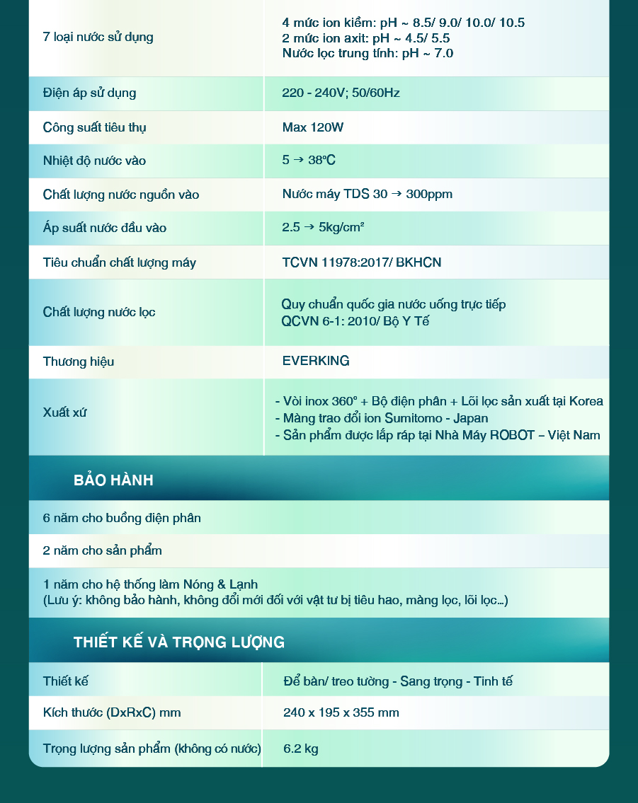 - Kiểu lắp đặt: Tủ đứng - Loại máy: Máy lọc nước RO hydrogen ion kiềm - Công nghệ lọc: RO kết hợp điện phân tạo nước ion kiềm - Số lõi lọc: 7 lõi - Lõi lọc thô: - Lõi 1: PP 5 micron (Sx Việt Nam) - Lõi 2: Than hoạt tính (Sx Việt Nam) - Lõi 3: Lõi Cation (Sx Việt Nam) - Lõi 4: PP 1 micron (Sx Việt Nam) - Lõi RO/Nano/UF: - RO 100 GPD sản xuất Hàn Quốc - Lõi chức năng: - Lõi 6: OrpH Hydrogen (Sx Việt Nam)Lõi 7: Nano Carbon (Sx Việt Nam) - Bảng điều khiển: Không có - Chỉ số nước: pH Không - Dung tích bình chứa: 6 lít - Tỉ lệ lọc - thải: Lọc 4.8 - Thải 5.2