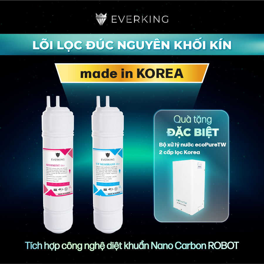 - 2 Nước lọc trung tính pH 7.0 (Nóng thông minh 4 mức nhiệt độ/Nguội) Chất lượng nước đạt chỉ số tối ưu, nồng độ Hydro hoạt tính lên đến ~ 800 -> 950 ppb, chống oxy hóa (ORP) lên đến ~ -400 -> -600 mV, chỉ số lý tưởng của máy lọc nước điện giải ion kiềm, được kiểm nghiệm trực tiếp tại Phòng Thí Nghiệm chuyên nghiệp cấp quốc gia. Chỉ số Hydrogen, ORP của nước tùy thuộc số tấm điện cực, đặc tính nguồn nước & “điều kiện đo trong phòng thí nghiệm chuyên nghiệp, đạt chuẩn”. Tích hợp chức năng Nóng Thông Minh đầy tiện ích – Đạt Kỷ Lục Châu Á – Bản quyền phát minh sáng chế Công nghệ vi điều khiển RMC/LCD tiên tiến, khác biệt vượt trội: Đỉnh cao công nghệ điện phân Korea Hệ thống đa cấp lọc hoàn hảo EVERKING EKDeluxePlus-117 được tích hợp công nghệ UF tiên tiến lọc nước trung tính, với hệ thống lọc đa cấp sản xuất Hàn Quốc vẫn “giữ được các khoáng chất tự nhiên của nước cho quá trình điện phân tạo nước điện giải bền vững 24/24 suốt vòng đời của máy”. Kiểu dáng hiện đại thiết kế thông minh Máy lọc nước điện giải EVERKING EKDeluxePlus-117 có kiểu dáng mới nhất, chuyên để bàn hoặc treo tường, thêm chức năng Nóng Thông Minh vô cùng độc đáo, duy nhất thị trường - phù hợp mọi không gian như nhà bếp, phòng ăn, phòng khách, văn phòng, Với sắc màu xanh trắng cẩm thạch chủ đạo, sản phẩm tạo nên cảm giác sang trọng, thư thái và đẳng cấp cho người sử dụng. Giá thành phải chăng cho mọi nhà Nếu so sánh với các sản phẩm nhập khẩu EVERKING EKDeluxePlus-117 có chất lượng vượt trội, đạt chuẩn quốc tế, nhưng giá thành siêu tiết kiệm. Đặc biệt, chi phí thay lõi lọc cũng luôn được nhà sản xuất đảm bảo trong mức dưới 2.000.000đ/năm. Kết hợp chế độ bảo hành chính hãng, luôn sẵn có vật tư linh kiện thay thế nhanh chóng với mức phí ưu đãi nhất. CHỨNG NHẬN CHẤT LƯỢNG EVERKING EKDeluxePlus-117 đạt các chứng nhận cấp quốc tế, Thiết bị Y Tế & An Toàn Điện Châu Âu CE, đăng ký FDA, xác lập Kỷ Lục Việt Nam, Châu Á & Thế Giới, Đĩa Vàng Sáng Tạo Thế Giới, đăng ký bản quyền sáng chế tại Quốc Tế.