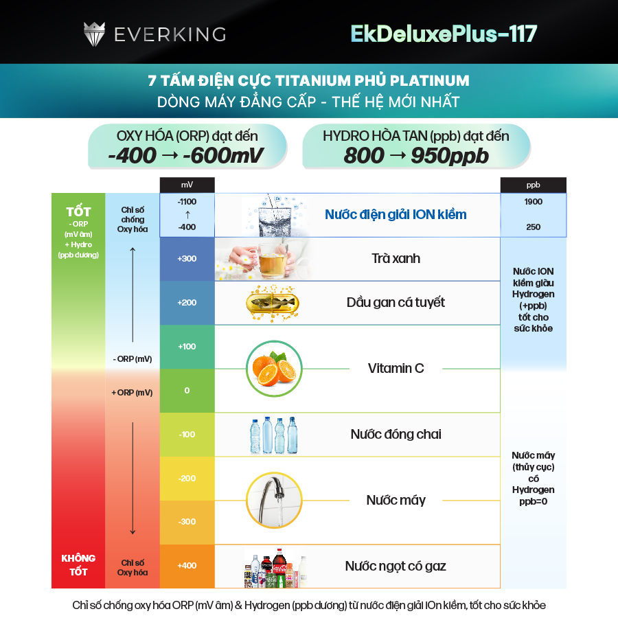 - Kiểu Để Bàn, Treo Tường, LCD mới nhất, phù hợp sử dụng tại nhà bếp, phòng ăn, đặc biệt đối với phòng khách, văn phòng,… sang trọng, đẳng cấp cho người sử dụng. Bản quyền sáng chế tại Việt Nam & Quốc Tế, nhiều tiện ích khác biệt vượt trội Công nghệ RMC-LCD mới nhất, hiển thị chi tiết, dễ dàng kiểm soát, sử dụng EVERKING là dòng máy duy nhất có khả năng cung cấp nhiều loại nước điện giải nhất hiện nay so với loại cùng tấm điện cực. EVERKING EKDeluxePlus-117 tạo đến 11 loại nước chức năng, phục vụ mọi nhu cầu sinh hoạt, gồm: