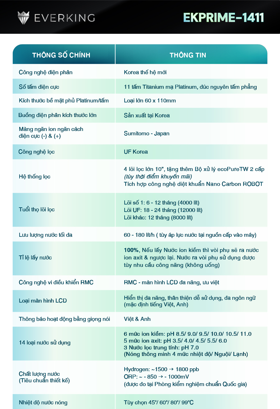 - 3 Nước lọc trung tính pH 7.0 (Nóng thông minh 4 mức nhiệt độ/Nguội/Lạnh) Chất lượng nước đạt chỉ số tối ưu, nồng độ Hydro hoạt tính lên đến ~ 1500 -> 1800 ppb, chống oxy hóa (ORP) lên đến ~ -850 -> -1000 mV, chỉ số lý tưởng của máy lọc nước điện giải ion kiềm, được kiểm nghiệm trực tiếp tại Phòng Thí Nghiệm chuyên nghiệp cấp quốc gia. Chỉ số Hydrogen, ORP của nước tùy thuộc số tấm điện cực, đặc tính nguồn nước & “điều kiện đo trong phòng thí nghiệm chuyên nghiệp, đạt chuẩn”. Tích hợp chức năng Nóng – Lạnh đầy tiện ích – Đạt Kỷ Lục Châu Á & Thế Giới – Bản quyền phát minh sáng chế Công nghệ vi điều khiển RMC/LCD tiên tiến, khác biệt vượt trội: Đỉnh cao công nghệ điện phân Korea Hệ thống đa cấp lọc hoàn hảo EVERKING EKPrime-1411 được tích hợp công nghệ UF tiên tiến lọc nước trung tính, với hệ thống lọc đa cấp sản xuất Hàn Quốc & công nghệ diệt khuẩn Nano Carbon (ROBOT) vẫn “giữ được các khoáng chất tự nhiên của nước cho quá trình điện phân tạo nước điện giải bền vững 24/24 suốt vòng đời của máy”. Kiểu dáng hiện đại thiết kế thông minh Máy lọc nước điện giải EVERKING EKPrime-1411 có kiểu dáng mới nhất, vô cùng độc đáo, duy nhất thị trường - phù hợp mọi không gian như nhà bếp, phòng ăn, phòng khách, văn phòng, Với sắc màu xanh trắng cẩm thạch chủ đạo, sản phẩm tạo nên cảm giác sang trọng, thư thái và đẳng cấp cho người sử dụng. Giá thành phải chăng cho mọi nhà Nếu so sánh với các sản phẩm nhập khẩu EVERKING EKPrime-1411 có chất lượng vượt trội, đạt chuẩn quốc tế, nhưng giá thành siêu tiết kiệm. Đặc biệt, chi phí thay lõi lọc cũng luôn được nhà sản xuất đảm bảo trong mức dưới 2.000.000đ/năm. Kết hợp chế độ bảo hành chính hãng, luôn sẵn có vật tư linh kiện thay thế nhanh chóng với mức phí ưu đãi nhất. CHỨNG NHẬN CHẤT LƯỢNG EVERKING EKPrime-1411 đạt các chứng nhận cấp quốc tế, Thiết bị Y Tế & An Toàn Điện Châu Âu CE, đăng ký FDA, xác lập Kỷ Lục Việt Nam, Châu Á & Thế Giới, Đĩa Vàng Sáng Tạo Thế Giới, đăng ký bản quyền sáng chế tại Quốc Tế. THÔNG SỐ KỸ THUẬT