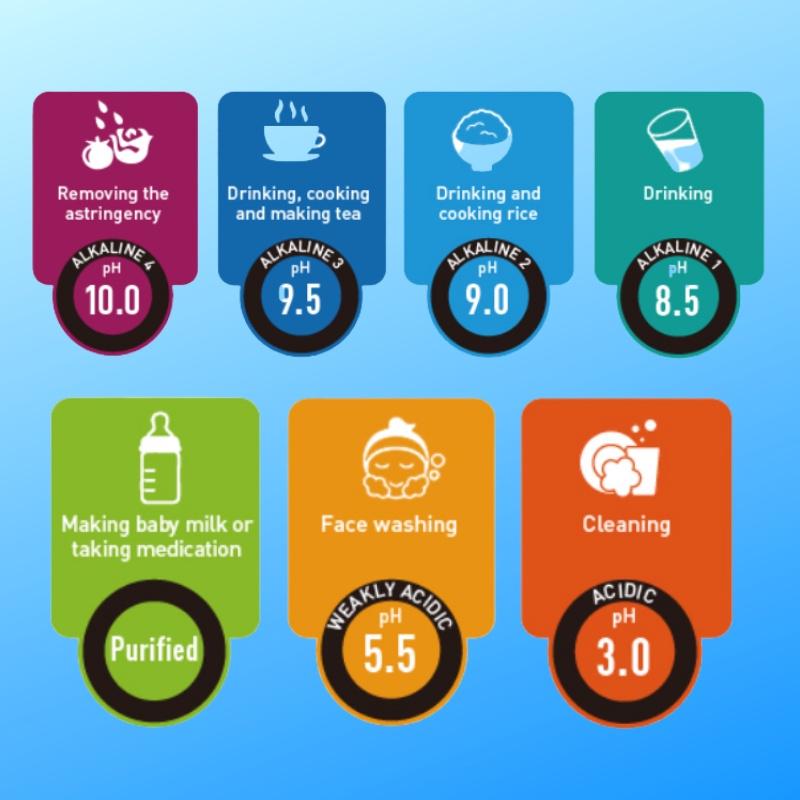 - Khả năng vận hành liên tục: Xấp xỉ 30 phút ở nhiệt độ phòng (xấp xỉ 10 phút đối với Mạnh hơn ở mức Kiềm 3 (Nước uống hàng ngày), mức Kiềm 4 (Kiềm mạnh), Axit nhẹ)