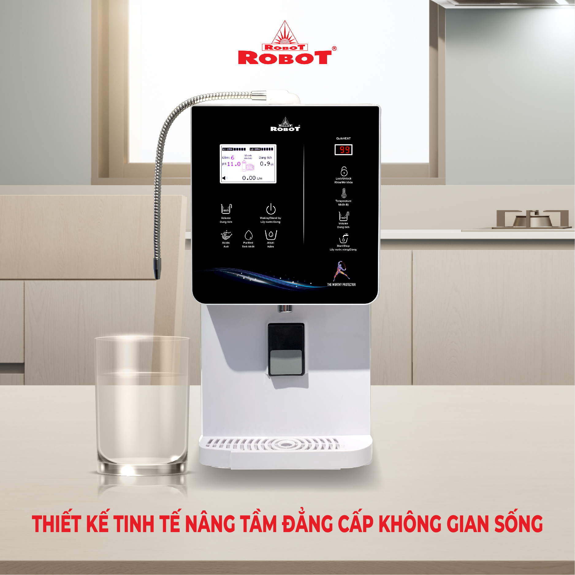 - Và 4 mức nước iON axit (pH 3.5/4.0/4.5/5.5). Chất lượng nước đạt chỉ số tối ưu, nồng độ Hydro hoạt tính lên đến ~ 1500 -> 1800 ppb, chống oxy hóa (ORP) lên đến ~ -850 -> -1000 mV, đáp ứng mọi nhu cầu sử dụng trong cuộc sống. Máy lọc nước điện giải iON kiềm Nóng Lạnh ROBOT ionQueen là dòng Để Bàn đầu tiên trên thế giới, được thiết kế kiểu dáng hiện đại, thiết kế chinh phục mọi không gian. Đặc biệt, được tích hợp thêm chức năng Nóng Thông Minh – Lạnh độc đáo & duy nhất trên thị trường, mang lại nhiều tiện ích cho người dùng. Chỉ số Hydrogen, ORP của nước tùy thuộc số tấm điện cực, đặc tính nguồn nước & “điều kiện đo trong phòng thí nghiệm chuyên nghiệp, đạt chuẩn”. Máy lọc nước điện giải iON kiềm Nóng Lạnh ROBOT ionQueen 1113, tạo 13 loại nước bổ ích, pH 3.5 --> 11.0 - Đáp ứng mọi nhu cầu trong cuộc sống Có thể tham khảo ý kiến của Bác sĩ hoặc chuyên gia dinh dưỡng để được hướng dẫn loại nước uống phù hợp nhất cho cơ thể. Kiểu dáng hiện đại - Thiết kế chinh phục mọi không gian ● Kiểu dáng để bàn, khác biệt so với các dòng điện giải khác ● Sử dụng linh hoạt cho mọi không gian ● Vòi nước điện giải xoay 360° ● Hệ thống điều khiển cảm ứng trên mặt phủ kính với màn hình LCD tinh tế Với mong muốn nhiều gia đình Việt có thể sử dụng nước điện giải iON kiềm với chi phí hợp lý để bảo vệ sức khỏe, sắc đẹp & nâng cao chất lượng cuộc sống, ROBOT mang đến sản phẩm “Chất lượng Quốc tế - Giá thành Việt Nam”, phù hợp với mức sống của nhiều người. Tiết kiệm cho người tiêu dùng đến hơn một nửa chí phí so với máy nhập khẩu chỉ từ 30 – 50%, nhưng sở hữu nhiều ưu điểm, tính năng vượt trội, chất lượng cao. Chế độ bảo hành chính hãng, tận nơi, vật tư và linh kiện, lõi lọc luôn có sẵn hạn chế tối đa chi phí sửa chữa, bảo trì. VĐV Cầu Lông Nguyễn Tiến Minh – tay vợt từng đứng Top 5 Thế Giới chia sẻ: Sau một thời gian sử dụng Máy lọc nước điện giải iON kiềm Minh thấy cải thiện sức khỏe rất nhiều và tốc độ hồi phục sau tập luyện, thi đấu cũng nhanh hơn so với trước đây. Bây giờ mỗi khi đi tập, hay khi đi thi đấu, Minh đều mang theo nước iON kiềm để uống. ROBOT là một thương hiệu Việt Nam uy tín nên Minh hoàn toàn tin tưởng và lựa chọn Máy lọc nước điện giải iON kiềm ROBOT. ️Thông Tin Thương Hiệu CÔNG TY CỔ PHẦN ĐẦU TƯ ROBOT