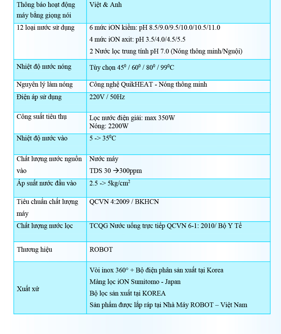 - Và 5 mức nước iON axit (pH 3.5/4.0/4.5/5.5). Chất lượng nước đạt chỉ số tối ưu, nồng độ Hydro hoạt tính lên đến ~ 1500 -> 1800 ppb, chống oxy hóa (ORP) lên đến ~ -850 -> -1000 mV, đáp ứng mọi nhu cầu sử dụng trong cuộc sống. Máy lọc nước điện giải iON kiềm Nóng ROBOT ionSmart được thiết kế kiểu dáng hiện đại, thiết kế chinh phục mọi không gian. Đặc biệt, bộ sưu tập 5 sắc màu pastel hiện đại đáp ứng mọi sở thích và phong cách nội thất, chắc chắn sản phẩm sẽ là điểm nhấn đặc sắc trong ngôi nhà của bạn. Chỉ số Hydrogen, ORP của nước tùy thuộc số tấm điện cực, đặc tính nguồn nước & “điều kiện đo trong phòng thí nghiệm chuyên nghiệp, đạt chuẩn”. ️ Máy lọc nước điện giải iON kiềm Nóng ROBOT ionSmart 1112, tạo 12 loại nước bổ ích, pH 3.5 --> 11.0 - Đáp ứng mọi nhu cầu trong cuộc sống Có thể tham khảo ý kiến của Bác sĩ hoặc chuyên gia dinh dưỡng để được hướng dẫn loại nước uống phù hợp nhất cho cơ thể. Kiểu dáng hiện đại - Thiết kế chinh phục mọi không gian