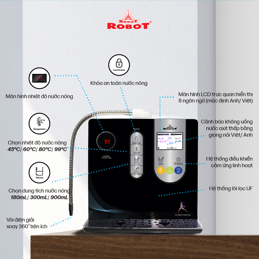 - Và 3 mức nước iON axit (pH 4.5/5.0/5.5). Chất lượng nước đạt chỉ số tối ưu, nồng độ Hydro hoạt tính lên đến ~ 1300 -> 1700 ppb, chống oxy hóa (ORP) lên đến ~ -800 -> -900 mV, đáp ứng mọi nhu cầu sử dụng trong cuộc sống. Máy lọc nước điện giải iON kiềm Nóng ROBOT ionSmart được thiết kế kiểu dáng hiện đại, thiết kế chinh phục mọi không gian. Đặc biệt, bộ sưu tập 5 sắc màu pastel hiện đại đáp ứng mọi sở thích và phong cách nội thất, chắc chắn sản phẩm sẽ là điểm nhấn đặc sắc trong ngôi nhà của bạn. ️ Chỉ số Hydrogen, ORP của nước tùy thuộc số tấm điện cực, đặc tính nguồn nước & “điều kiện đo trong phòng thí nghiệm chuyên nghiệp, đạt chuẩn”. ️ Máy lọc nước điện giải iON kiềm Nóng ROBOT ionSmart 911, tạo 11 loại nước bổ ích, pH từ 4.5 đến 11.0- Đáp ứng mọi nhu cầu trong cuộc sống Có thể tham khảo ý kiến của Bác sĩ hoặc chuyên gia dinh dưỡng để được hướng dẫn loại nước uống phù hợp nhất cho cơ thể. ️ Kiểu dáng hiện đại - Thiết kế chinh phục mọi không gian