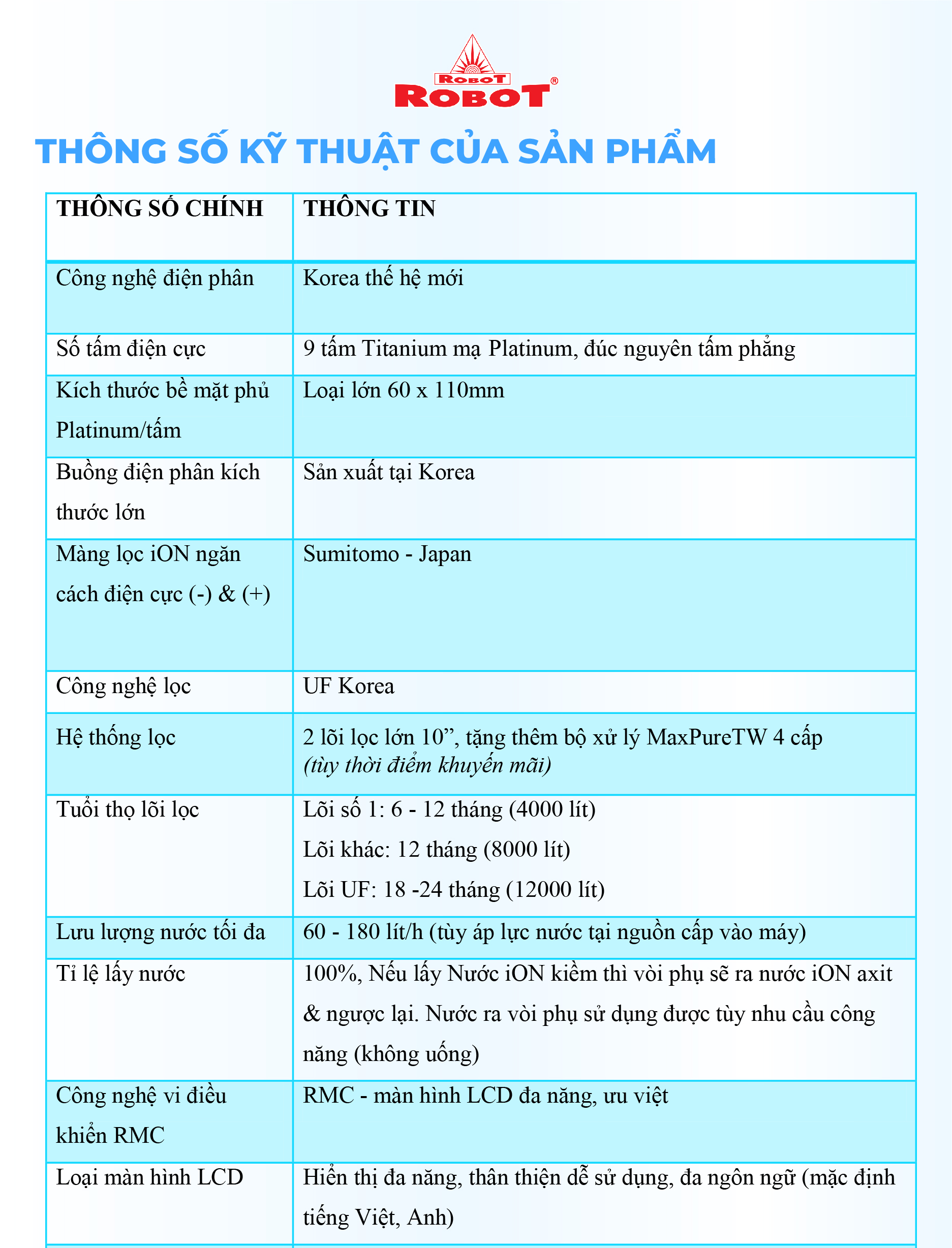 - ️ Máy lọc nước điện giải iON kiềm ROBOT ionSmart 911 là sản phẩm được sản xuất với công nghệ tiên tiến, cao cấp trang bị đến 9 tấm điện cực lớn nhất, có khả năng tạo ra đến 11 loại nước đa chức năng, với 6 mức nước iON kiềm (pH 8.5 - 11.0), nước lọc trung tính (pH 7.0) Nguội – Nóng & 3 mức nước iON axit (pH 4.5 - 5.5). Chất lượng nước đạt chỉ số tối ưu, nồng độ Hydro hoạt tính lên đến ~ 1300 -> 1700 ppb, chống oxy hóa (ORP) lên đến ~ -800 -> -900 mV, đáp ứng mọi nhu cầu sử dụng trong cuộc sống.