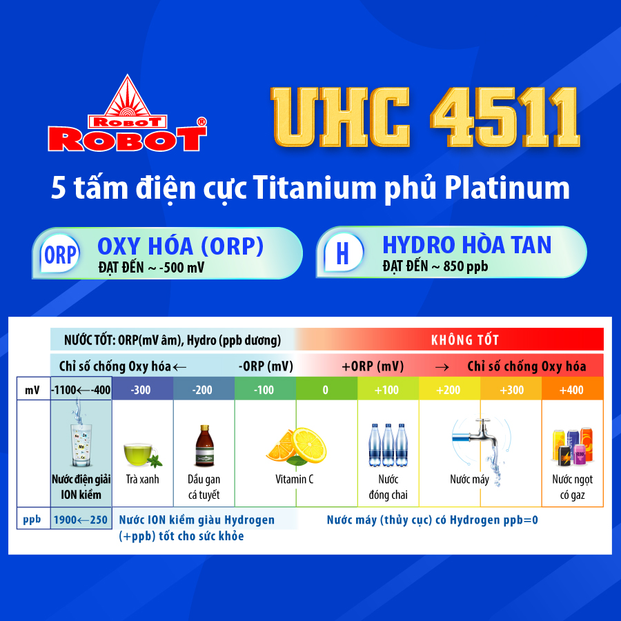 Máy lọc nước điện giải iON kiềm ROBOT UHC 4511 là model đặc biệt sản xuất với công nghệ tiên tiến hàng đầu thế giới, trang bị 5 tấm điện cực lớn nhất, có khả năng tạo ra đến 11 loại nước đa chức năng, với 5 mức nước iON kiềm (pH 8.5 - 10.5), nước lọc trung tính - Nóng - Lạnh (pH 7.0) & 3 mức nước iON axit (pH 4.5 - 5.5), có thể điều chỉnh, thay đổi tùy theo đặc tính nguồn nước tại nơi lắp đặt. Với nồng độ Hydro hoạt tính lên đến ~ 750 -> 850 ppb, chống oxy hóa (ORP) lên đến ~ -350 -> -500 mV, đáp ứng mọi nhu cầu sử dụng trong cuộc sống.