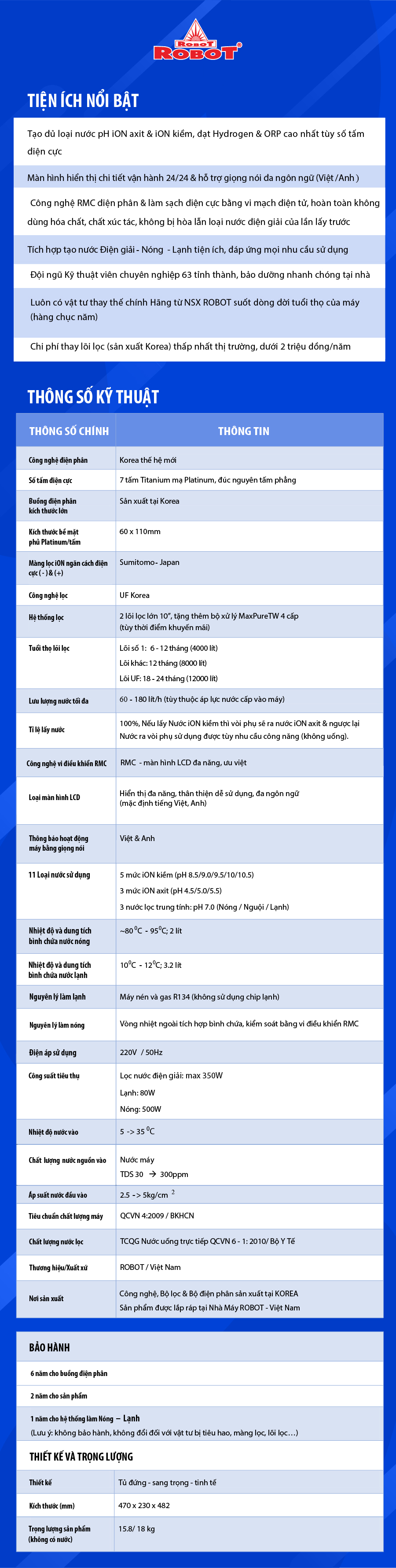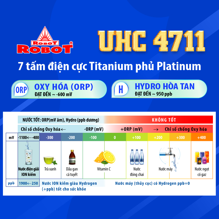 Máy lọc nước điện giải iON kiềm ROBOT UHC 4711 là model đặc biệt sản xuất với công nghệ tiên tiến hàng đầu thế giới, trang bị đến 7 tấm điện cực lớn nhất, có khả năng tạo ra đến 11 loại nước đa chức năng, với 5 mức nước iON kiềm (pH 8.5 - 10.5), nước lọc trung tính - Nóng - Lạnh (pH 7.0) & 3 mức nước iON axit (pH 4.5 - 5.5), có thể điều chỉnh, thay đổi tùy theo đặc tính nguồn nước tại nơi lắp đặt. Với nồng độ Hydro hoạt tính lên đến ~ 800 -> 950 ppb, chống oxy hóa (ORP) lên đến ~ -400 -> -600 mV, đáp ứng mọi nhu cầu sử dụng trong cuộc sống.