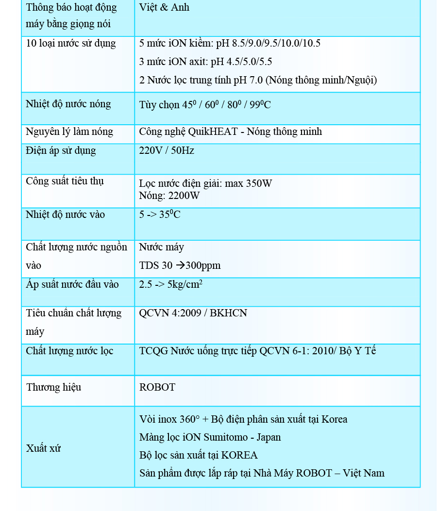 Tổng quan - Kiểu lắp đặt:Tủ đứng - Loại máy:Máy lọc nước RO nóng nguội lạnh - Công nghệ lọc:Thẩm thấu ngược RO - Kháng khuẩn:Nano Silver - Dung tích bình chứa:Tổng 7.8 lít (Nước nóng 0.8 lít, nước lạnh 1 lít, nước thường 6 lít) - Tỷ lệ lọc - thải:Lọc 4.8 - Thải 5.2 (Tỷ lệ này phụ thuộc vào chất lượng nước đầu vào) - Công suất lọc:18 lít/giờ - Công suất tiêu thụ điện trung bình khoảng:0.628 kW/h - Nhiệt độ nước hãng công bố:Nóng 80 - 90°C, Lạnh 10°C - Nhiệt độ nước thực tế:Nóng 80 - 90°C, Lạnh 10°C - Áp lực nước yêu cầu:0.07 - 0.25 MPa - Nơi sản xuất máy bơm:Trung Quốc - Năm ra mắt:2023 - Thương hiệu:Việt Nam - Nơi sản xuất:Việt Nam Thông tin lõi lọc - Số lõi lọc:10 lõi -