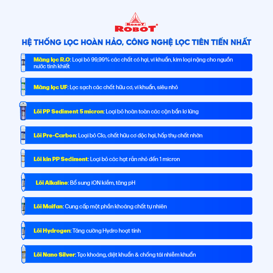 • Máy được tích hợp 2 công nghệ lọc tối ưu nhất hiện nay là UF (Ultrafiltration) & R.O (Reverse Osmosis) cho nguồn nước sau lọc sạch tối đa, được loại bỏ hoàn toàn cặn bẩn hay chất gây hại. Được trang bị thêm công nghệ vi điều khiển RMC-LCD thiết kế phát minh mới của ROBOT, hỗ trợ người dùng trực tiếp kiểm soát chất lượng nước trước & sau lọc, cảnh báo rủi ro trong quá trình sử dụng.   Với công nghệ “Bảo vệ 3 tầng”, máy lọc nước ROBOT được các chuyên gia đánh giá là sản phẩm bảo vệ tuyệt đối an toàn cho sức khỏe   Hệ thống đa cấp lọc mạnh mẽ của ROBOT ALPHA PRO 9GK-UR
