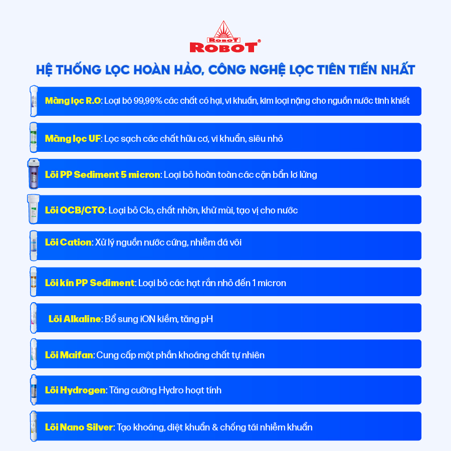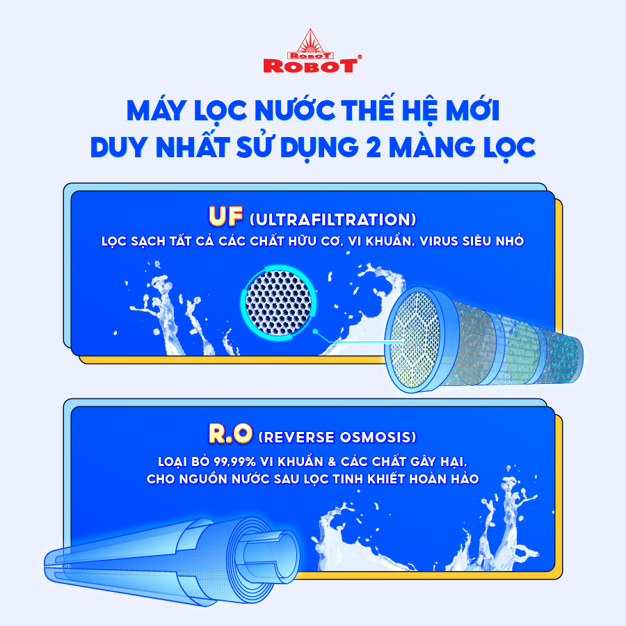 - Máy được tích hợp 2 công nghệ lọc tối ưu nhất hiện nay là UF (Ultrafiltration) & R.O (Reverse Osmosis) cho nguồn nước sau lọc sạch tối đa, được loại bỏ hoàn toàn cặn bẩn hay chất gây hại. Hệ thống đa cấp lọc mạnh mẽ của ROBOT SPRING PRO 410GH-UR
