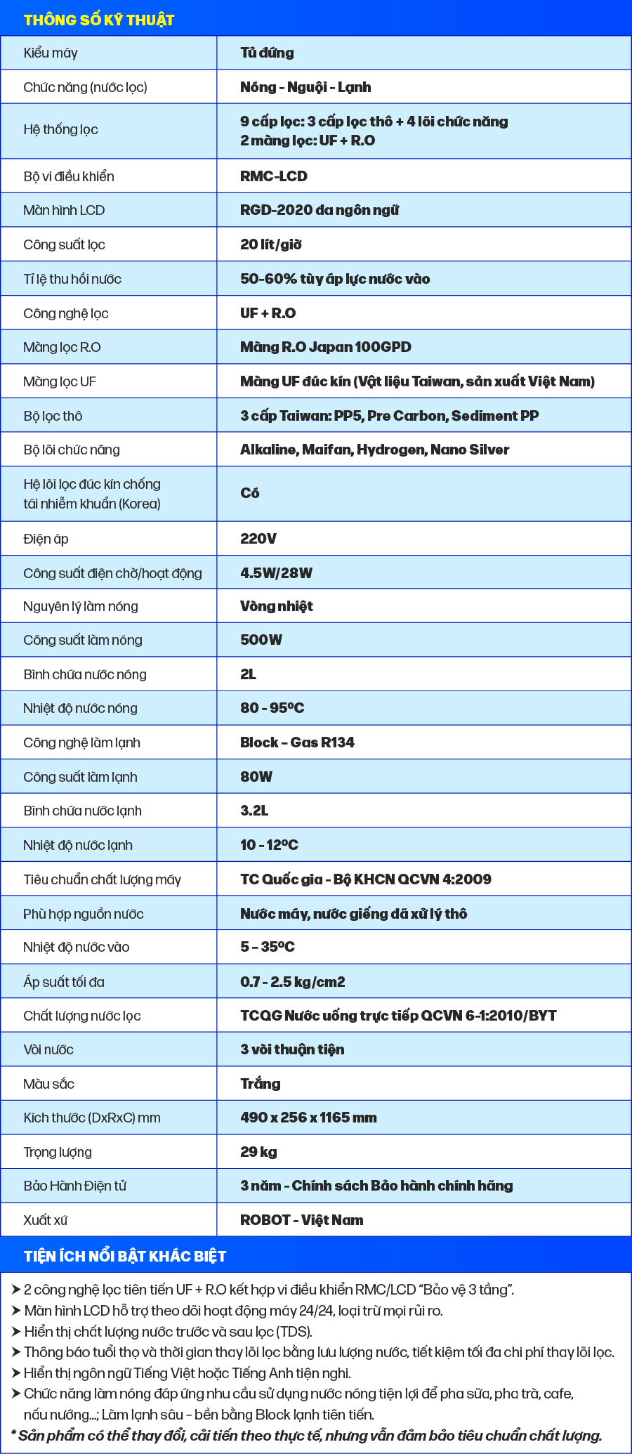 Tổng quan - Kiểu lắp đặt:Tủ đứng - Loại máy:Máy lọc nước RO nóng nguội lạnh - Công nghệ lọc:Thẩm thấu ngược RO - Kháng khuẩn:Nano Silver - Dung tích bình chứa:Tổng 7.8 lít (Nước nóng 0.8 lít, nước lạnh 1 lít, nước thường 6 lít) - Tỷ lệ lọc - thải:Lọc 4.8 - Thải 5.2 (Tỷ lệ này phụ thuộc vào chất lượng nước đầu vào) - Công suất lọc:18 lít/giờ - Công suất tiêu thụ điện trung bình khoảng:0.628 kW/h - Nhiệt độ nước hãng công bố:Nóng 80 - 90°C, Lạnh 10°C - Nhiệt độ nước thực tế:Nóng 80 - 90°C, Lạnh 10°C - Áp lực nước yêu cầu:0.07 - 0.25 MPa - Nơi sản xuất máy bơm:Trung Quốc - Năm ra mắt:2023 - Thương hiệu:Việt Nam - Nơi sản xuất:Việt Nam Thông tin lõi lọc - Số lõi lọc:10 lõi -