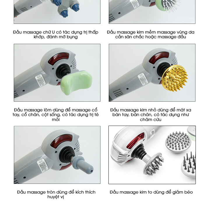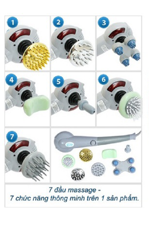 - Đầu massage số 7: Đầu massage mềm dùng để massage mặt, massage đầu Không chỉ cung cấp kết quả công hiệu như các bài tập thể dục, máy massage cầm tay 7 đầu còn giúp làm dịu và thư giãn các cơ bắp bị đau do đứng hoặc ngồi lâu. Giảm đau nhức mỏi các vùng như lưng , vai, gáy… kích thích quá trình lưu thông tuần hoàn máu trên cơ thể. Sử dụng máy massage thường xuyên hàng ngày sẽ giúp ngăn chặn bệnh đau cơ một cách hiệu quả và giúp cơ thể sảng khoái và phần chấn hơn. 3Trân trọng cảm ơn Quý khách hàng!