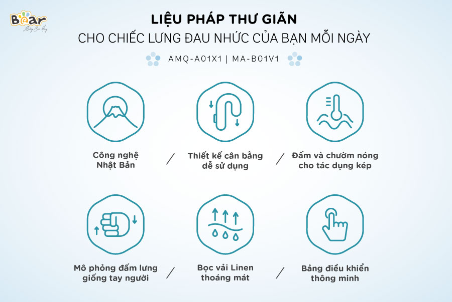 Máy đấm lưng Bear AMQ-A01X1 (MA-B01V1) thiết kế dạng đai cân bằng thông minh, sử dụng công nghệ Nhật Bản mô phỏng chân thật nhất phương pháp đấm massage như tay người giúp bạn thư