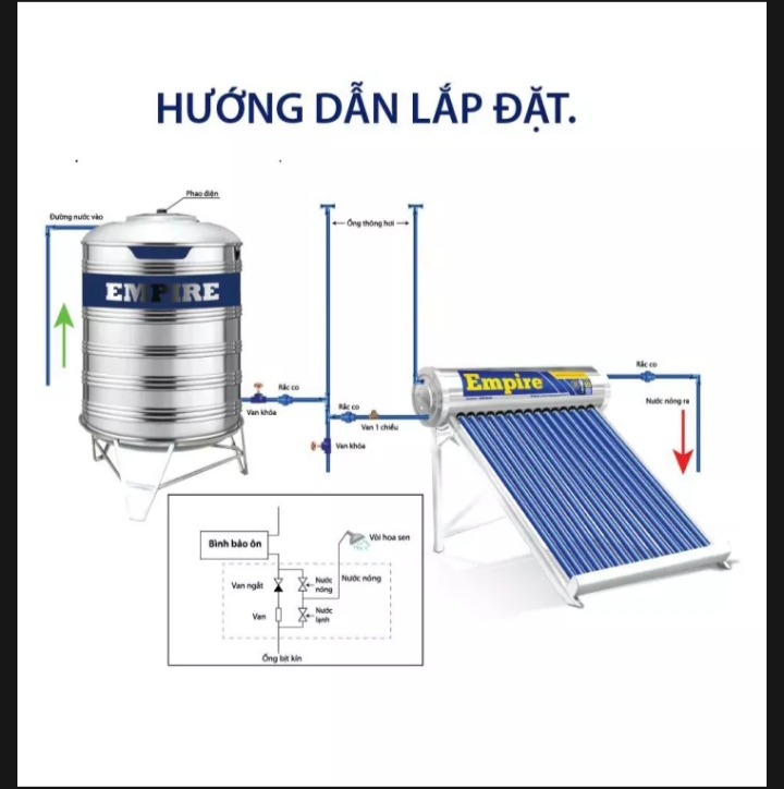 Mua tại TiktokMáy Nước Nóng Năng LượngMặt Trời Empire Era Sun -Model E - 316 PG 200 lít Thông tin sản phẩm: Tên sản phẩm Empire Era Sun 20 Thời gian giữ nhiệt: liên tục 96h. Kích thước: 1270 x 1625 x 1200 mm Dung tích: 200 lít Chất liệu: Inox 316 Hệ thống ống chân không áp dụng công nghệ Nanomax giúp hấp thụ nhiệt lên đến 99%. Chịu được mưa đá 25mm. _ Ruột bình bảo ôn:Inox SUS 316 chống ăn mòn, Inox 316 được dùng trong lĩnh vực y tế và ngâm hóa chất. Lớp bảo ôn Polyurethane:Mật độ cao được phun ở áp lực cao, thời gian giữ nhiệt trên 96 giờ. Vỏ bảo ôn: 100% làm bằng inox 304 cao cấp Khung đỡ: Làm bằng vật liệu Alumin siêu bèn. Bảo hành lên đến 7 năm.